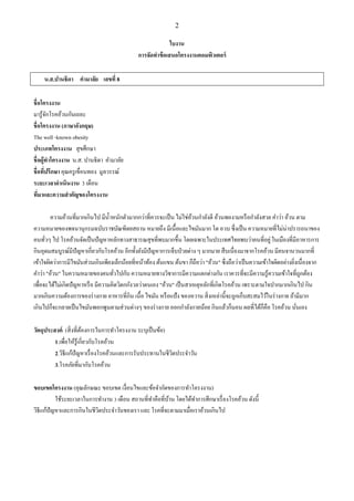8 ชื่อโครงงาน มารู้จักโรคอ้วนกันเถอะ ชื่อโครงงาน (ภาษาอังกฤษ) The well -known obesity ประเภทโครงงาน สุขศึกษา ชื่อผู้ทาโครงงาน น.ส. ปานธิดา คามาลัย ชื่อที่ปรึกษา คุณครูเขื่อนทอง มูลวรรณ์ ระยะเวลาดาเนินงาน 3 เดือน ที่มาและความสาคัญของโครงงาน ความอ้วนที่มากเกินไป มีน้าหนักตัวมากกว่าที่ควรจะเป็น ไม่ใช่อ้วนกาลังดี อ้วนพองามหรือกาลังสวย คาว่า อ้วน ตาม ความหมายของพจนานุกรมฉบับราชบัณฑิตยสถาน หมายถึง มีเนื้อและไขมันมาก โต อวบ ซึ่งเป็น ความหมายที่ไม่น่าปรารถนาของ คนทั่วๆ ไป โรคอ้วนจัดเป็นปัญหาหลักทางสาธารณสุขที่พบมากขึ้น โดยเฉพาะในประเทศไทยพบว่าคนที่อยู่ในเมืองที่มีอาหารการ กินอุดมสมบูรณ์มีปัญหาเกี่ยวกับโรคอ้วน อีกทั้งยังมีปัญหาการเจ็บป่วยต่าง ๆ มากมาย สืบเนื่องมาจากโรคอ้วน มีคนจานวนมากที่ เข้าใจผิดว่าการมีไขมันส่วนเกินเพียงเล็กน้อยที่หน้าท้อง ต้นแขน ต้นขา ก็ถือว่า "อ้วน" ซึ่งถือว่าเป็นความเข้าใจผิดอย่างยิ่งเนื่องจาก คาว่า "อ้วน" ในความหมายของคนทั่วไปกับ ความหมายทางวิชาการมีความแตกต่างกัน เราควรที่จะมีความรู้ความเข้าใจที่ถูกต้อง เพื่อจะได้ไม่เกิดปัญหาหรือ มีความคิดวิตกกังวลว่าตนเอง "อ้วน" เป็นสาเหตุหลักที่เกิดโรคอ้วน เพราะตามใจปากมากเกินไป กิน มากเกินความต้องการของร่างกาย อาหารที่กิน เนื้อ ไขมัน หรือแป้ง ของหวาน สิ่งเหล่านี้จะถูกเก็บสะสมไว้ในร่างกาย ถ้ามีมาก เกินไปก็จะกลายเป็นไขมันพอกพูนตามส่วนต่างๆ ของร่างกาย ออกกาลังกายน้อย กินแล้วก็นอน ผลที่ได้ก็คือ โรคอ้วน นั่นเอง วัตถุประสงค์ (สิ่งที่ต้องการในการทาโครงงาน ระบุเป็นข้อ) 1.เพื่อให้รู้เกี่ยวกับโรคอ้วน 2.วิธีแก้ปัญหาเรื่องโรคอ้วนและการรับประทานในชีวิตประจาวัน 3.โรคภัยที่มากับโรคอ้วน ขอบเขตโครงงาน (คุณลักษณะ ขอบเขต เงื่อนไขและข้อจากัดของการทาโครงงาน) ใช้ระยะเวลาในการทางาน 3 เดือน สถานที่ทาคือที่บ้าน โดยได้ทาการศึกษาเรื่องโรคอ้วน ดังนี้ วิธีแก้ปัญหาและการกินในชีวิตประจาวันของเรา และ โรคที่จะตามมาเมื่อเราอ้วนเกินไป