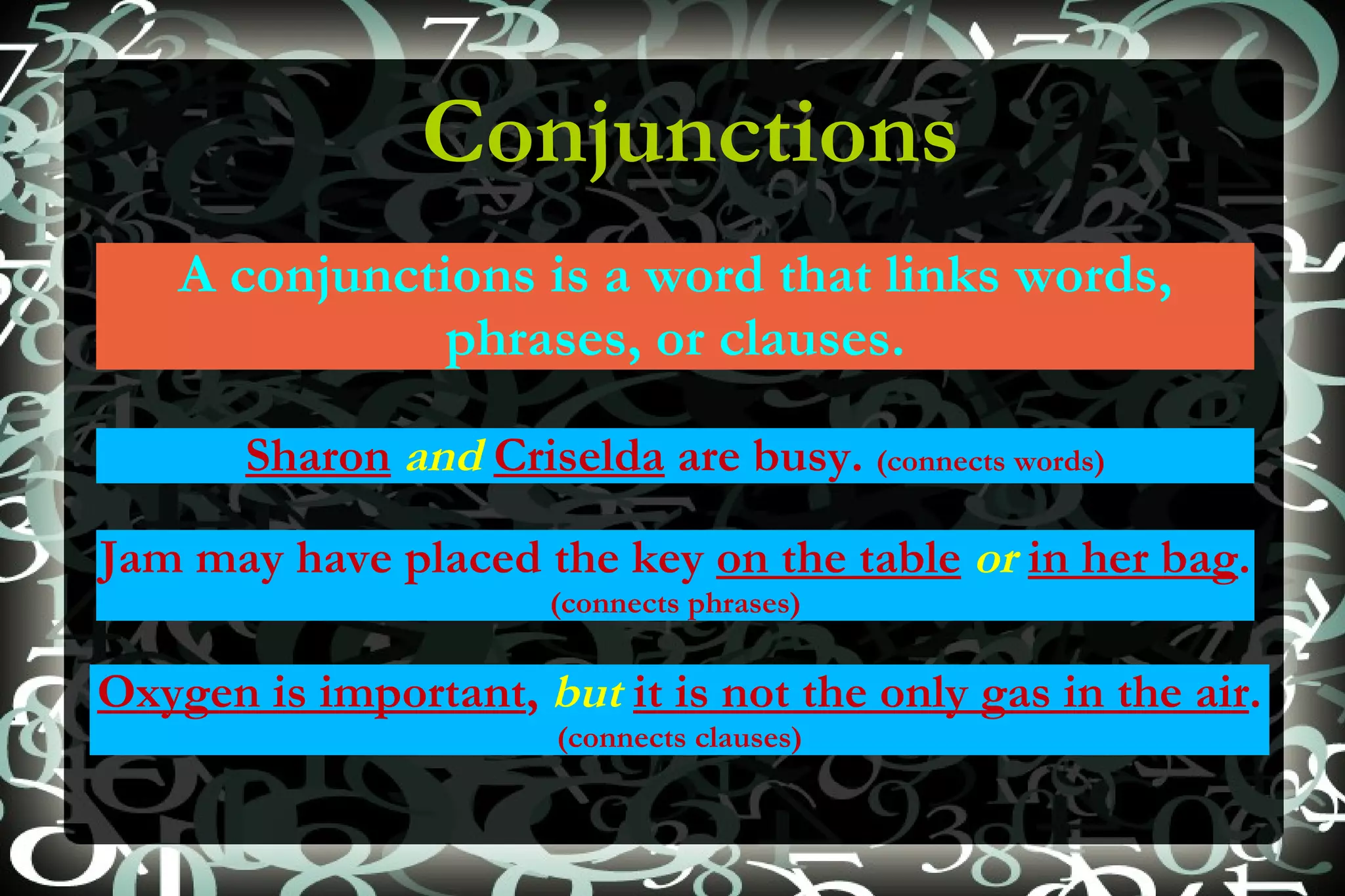 There are different types of conjunctions that link words, phrases, and clauses in a sentence. Coordinating conjunctions join grammatically equal parts of a sentence using FANBOYS conjunctions like "and" and "but". Subordinating conjunctions connect a main clause to a subordinate clause using conjunctions that indicate time, cause and effect, opposition, or condition. Correlative conjunctions link balanced words, phrases, and clauses in pairs like "both...and". Adverbial conjunctions create complex relationships between ideas using conjunctions that indicate addition, comparison, concession, emphasis, example, contrast, or time sequence.