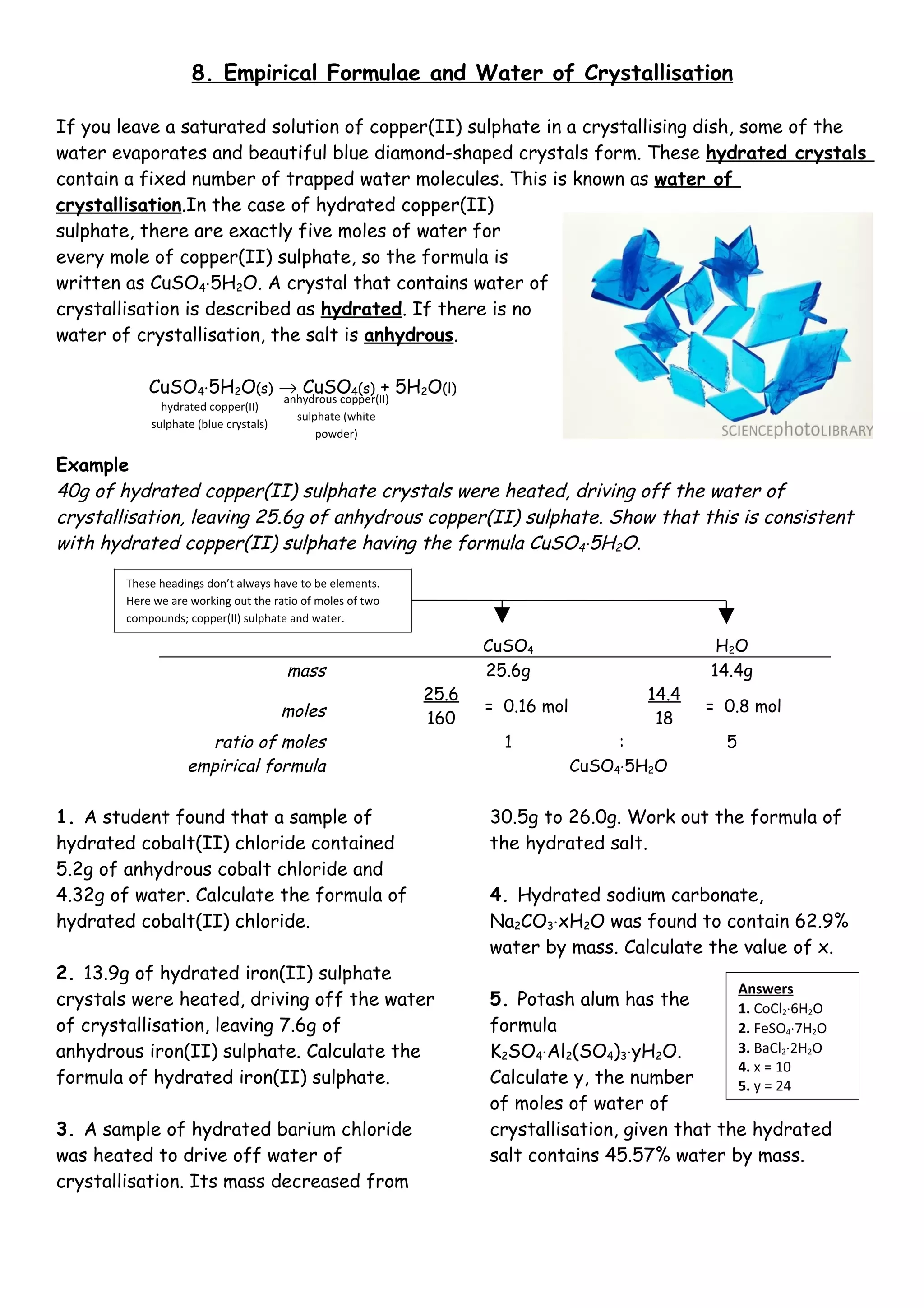 The document discusses the concepts of empirical formulae and water of crystallisation using copper(II) sulphate as an example, explaining the formation of hydrated and anhydrous states. It provides calculations to demonstrate the consistent formula of hydrated copper(II) sulphate (CuSO4·5H2O) based on experimental data. Additionally, it mentions other hydrated compounds and presents calculations to derive their formulas based on water content.
