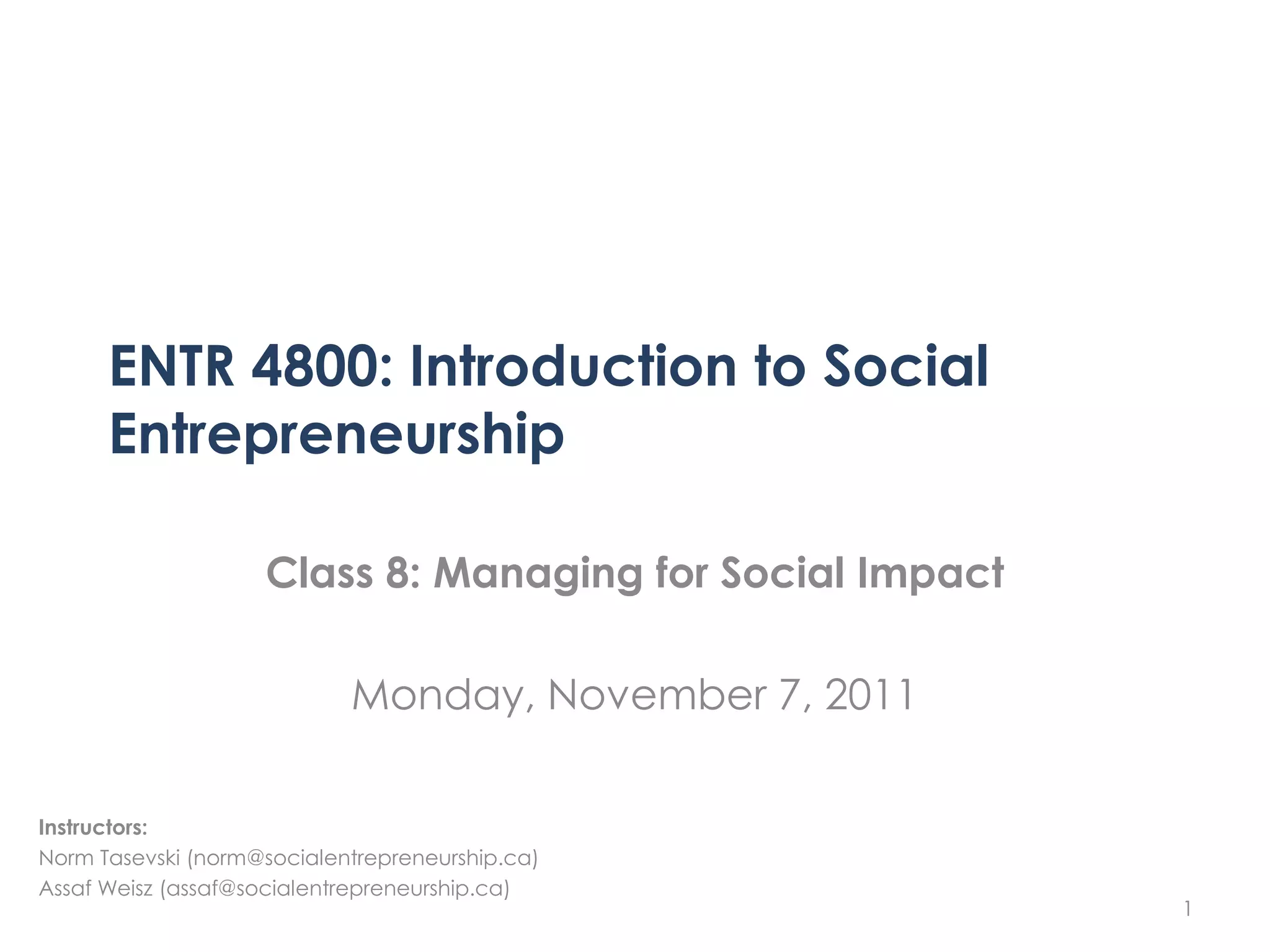This document summarizes a class on managing social enterprises for social impact. The class covered: [1] The responsibilities of managing both financial and social goals; [2] Measuring social impact through identifying goals, measuring outcomes, and addressing challenges; and [3] Communicating social impact to different audiences through clear messaging. The class provided frameworks for balancing social and financial value as well as examples of social impact measurement from organizations.