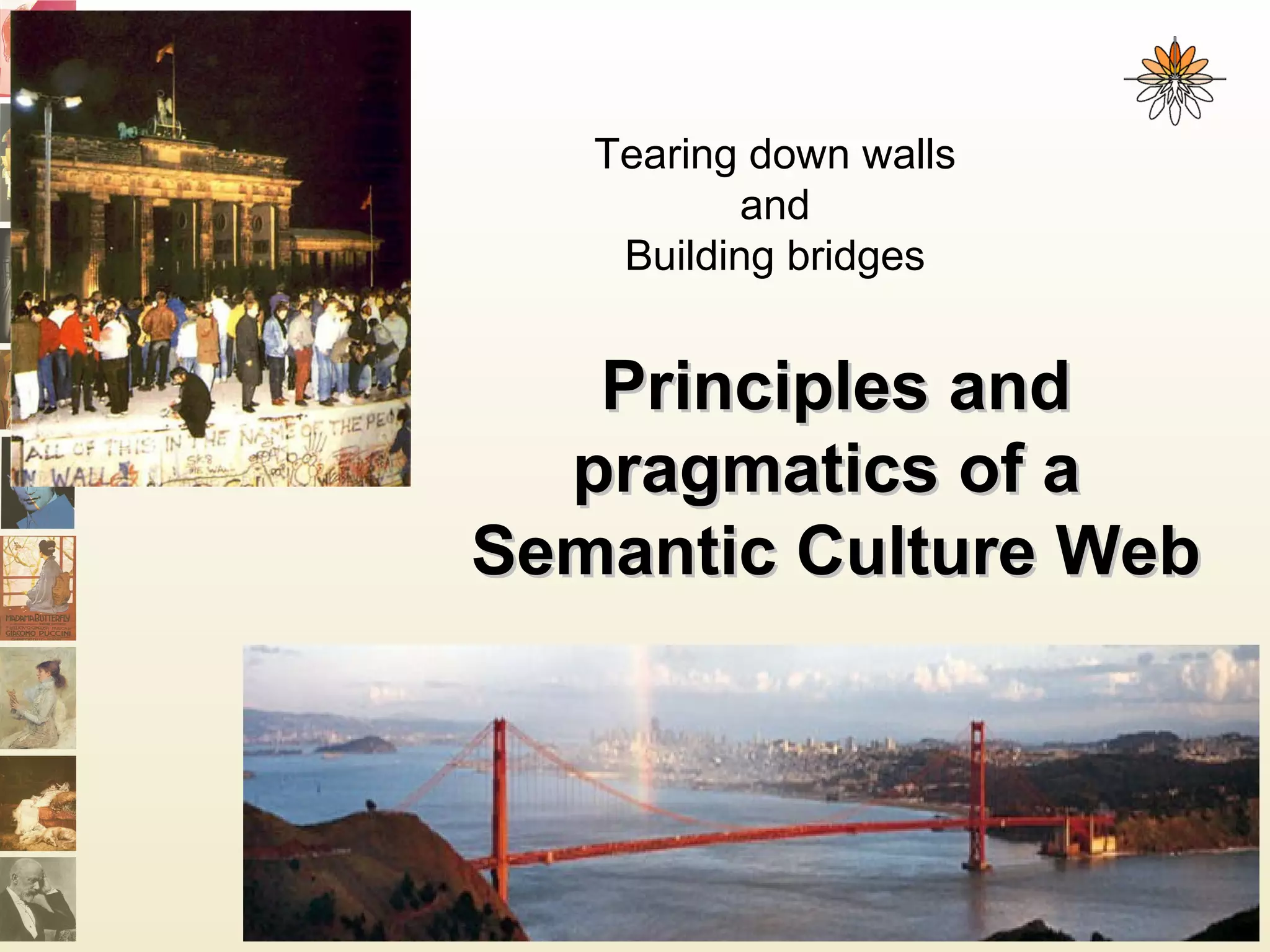 1. The document discusses the principles and pragmatics of a Semantic Culture Web, which involves tearing down walls between collections and building bridges between them through semantic annotation and linking of resources.