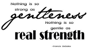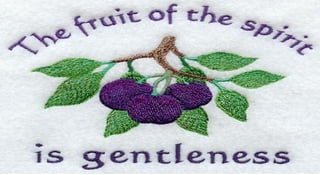 1) The document discusses the fruit of the spirit gentleness from Galatians 5:22. It provides examples of gentleness from Saint Francis de Sales and Leo Rosten.