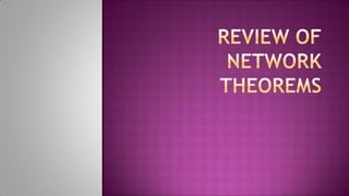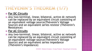 The document discusses various circuit analysis theorems including Thévenin's theorem, Norton's theorem, and superposition theorem. Thévenin's theorem states that any linear bilateral network can be reduced to an equivalent circuit with a voltage source and series resistance. Norton's theorem is the dual of Thévenin's theorem, representing an equivalent circuit with a current source and parallel conductance. Superposition theorem allows analyzing circuit responses by separately applying each independent source and summing the responses.