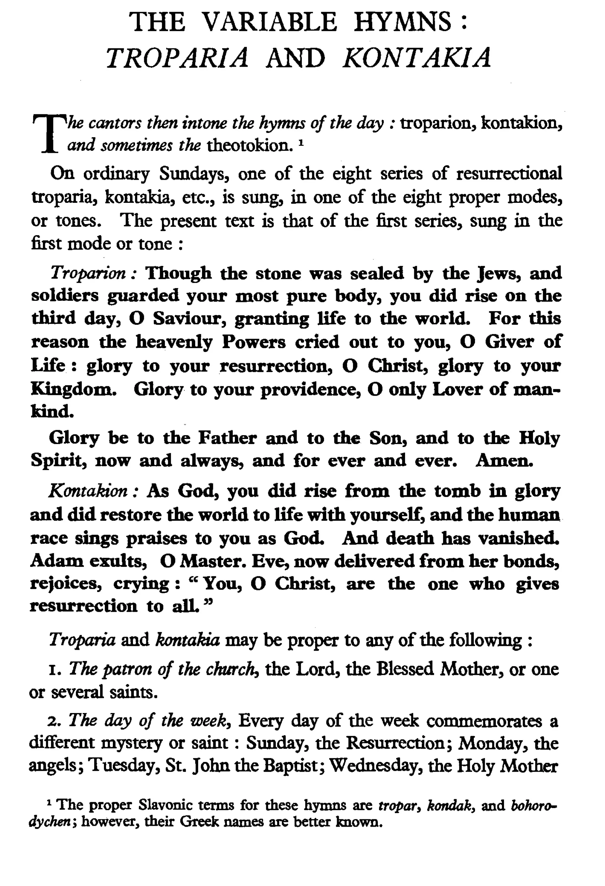 The document discusses the troparia and kontakia, which are variable hymns sung in the Byzantine liturgy. It explains that on ordinary Sundays, one of eight series of resurrectional troparia and kontakia is sung, following the proper musical mode or tone for that week. It also describes how troparia and kontakia can be specific to saints, days of the week, or special occasions. Precise rules govern how different sets are combined based on liturgical precedence. The origins of Christian hymnody drew from Hebrew psalms and incorporated new types of hymns over time, though private compositions were later discouraged due to heresy risks.