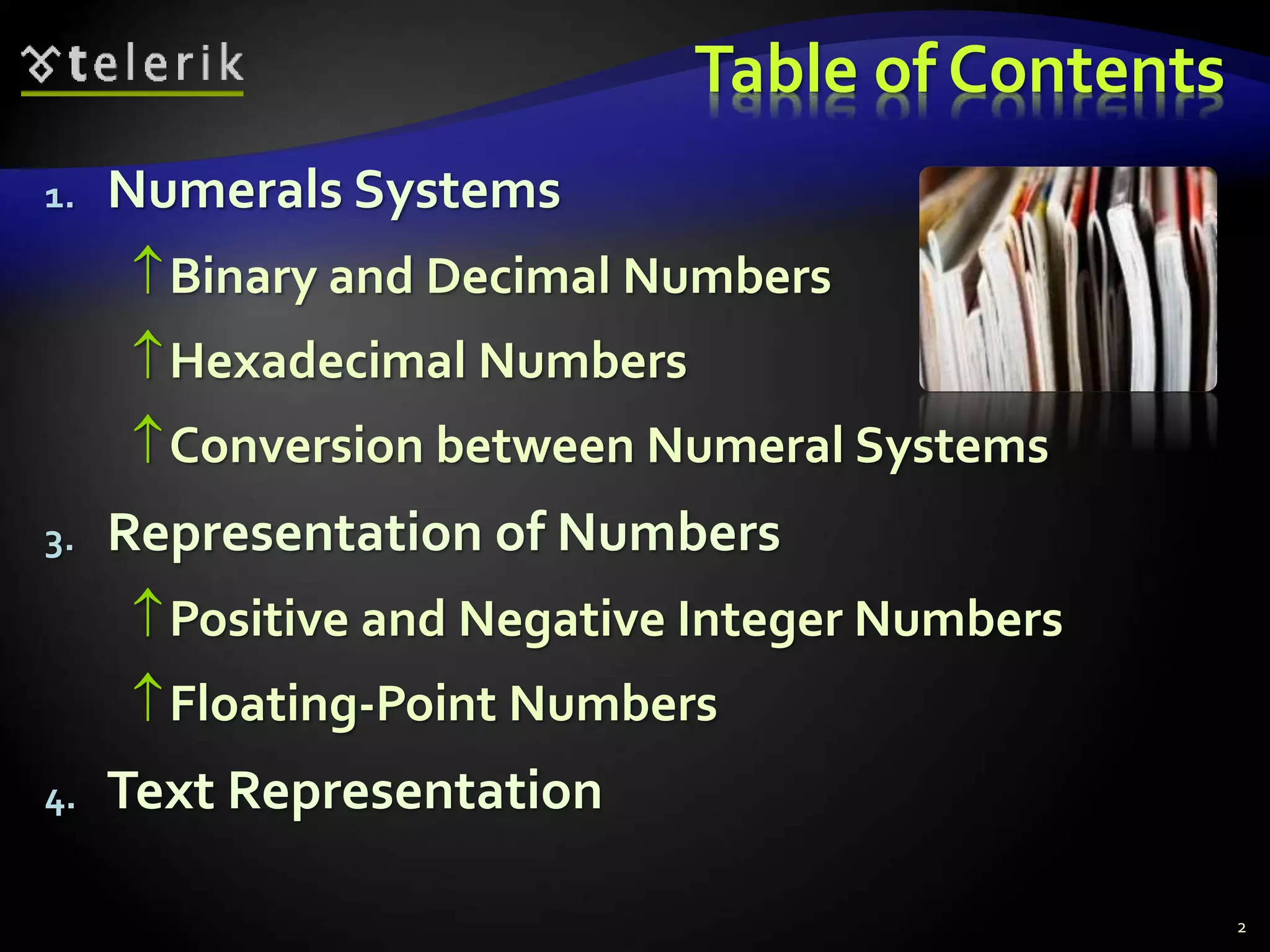 This document discusses different numeral systems including binary, decimal, and hexadecimal. It provides details on: