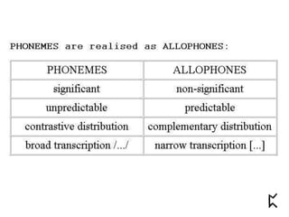 The document discusses phonetics and phonology. Phonetics is the study of the physical properties of speech sounds, including how sounds are made, heard, and transmitted. Phonology is the study of the linguistic properties of speech sounds and how they function in language. Key terms discussed include phones (sounds of language), phonemes (significant sound differences), and allophones (non-significant sound differences).