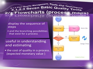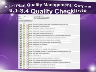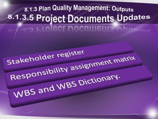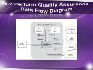 The document discusses quality management processes for a project. It describes identifying quality requirements and standards, documenting how the project will comply with requirements, and providing guidance on quality management and validation. Quality roles and responsibilities are defined, as are metrics for measuring quality and checklists for verifying quality requirements. Process improvement approaches are also covered.