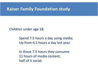 Children now spend on average 7.5 hours per day using media and consume 11 hours of media content per day, with social media accounting for half of that time. Barack Obama was able to use social media effectively in his 2007 campaign against Hillary Clinton by finding passionate online communities and linking them to his campaign. His grassroots approach online legitimized his candidacy as an outsider. United Airlines' poor response to a YouTube video about how they broke a musician's guitar showed how social media can amplify customer complaints.