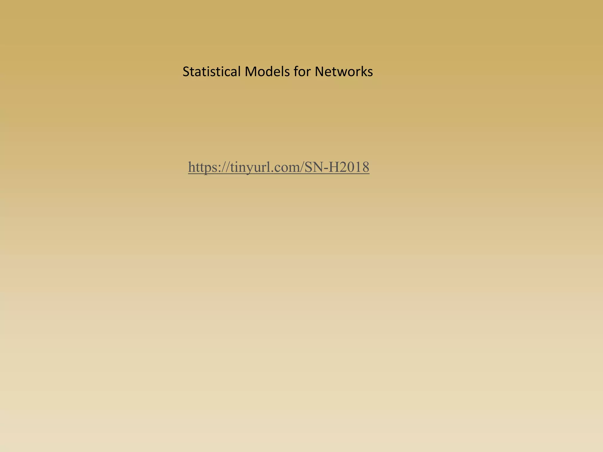 The document discusses statistical models for networks. It covers types of inference problems in networks, simple random graphs models, and less random graph models that condition on additional network features like degree distribution or mixing patterns. It also discusses comparing two networks using quadratic assignment procedures and generating networks with appropriate degree distributions for comparison.