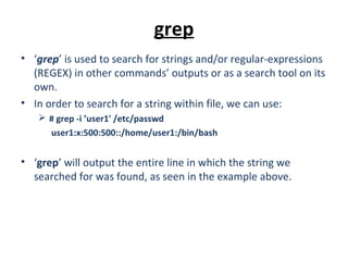 grep is used to search for strings and regular expressions in files and outputs. It has options like -i for case-insensitive searching, -v to return non-matching lines, and -r for recursive searching. cut filters out fields or columns delimited by a character like a colon. sort sorts data alphabetically or numerically with options like -r to reverse the sort order. uniq searches for duplicate lines and has options like -c to output a count of occurrences. tr translates characters between two given sets on a character-to-character basis. tail and head print the end or beginning of a file, with options to specify the number of lines.