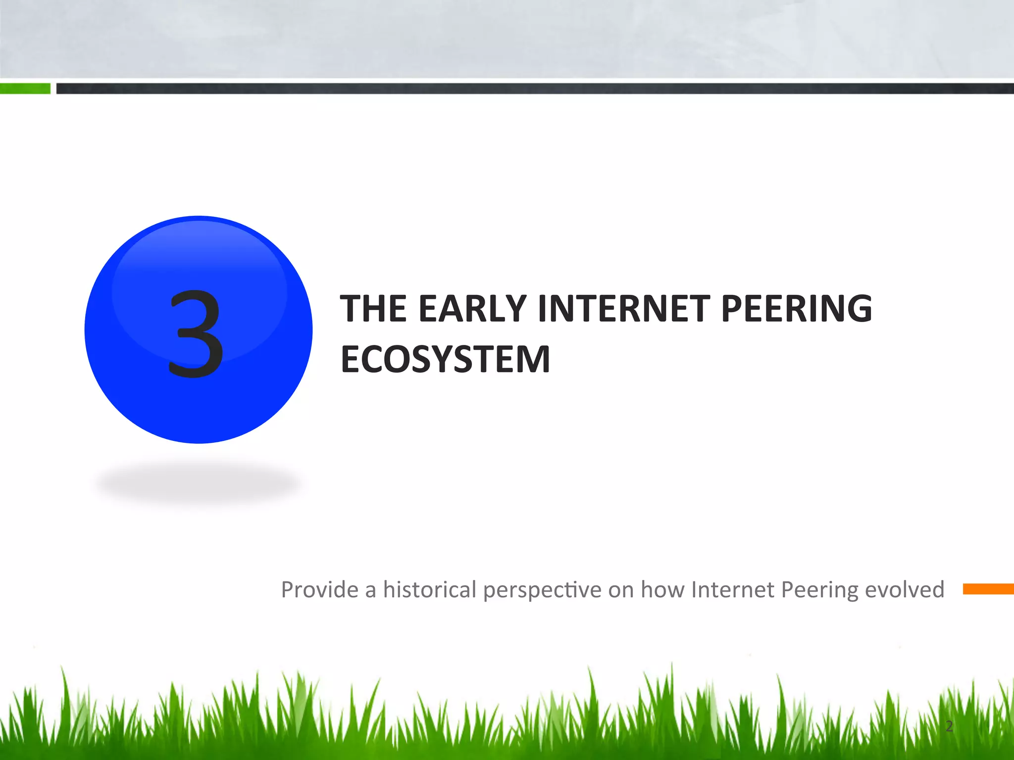 The document provides a historical perspective on the evolution of internet peering. It describes how peering began in the 1980s between ARPANET and other networks to connect organizations. It then discusses the NSFNET period from 1987-1994 when the National Science Foundation operated the backbone. In the 1994-1996 transition period, peering moved to Network Access Points but these became congested. By the late 1990s, large ISPs moved to private peering arrangements via direct connections due to these issues. This led to the current global internet peering ecosystem with no central coordination.