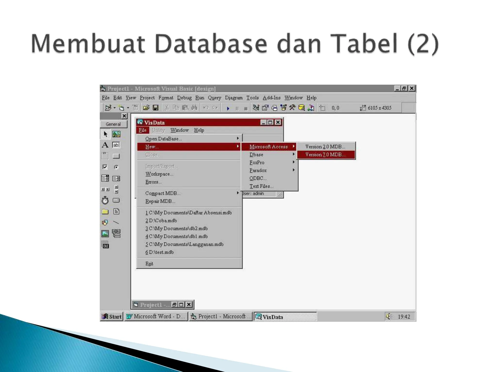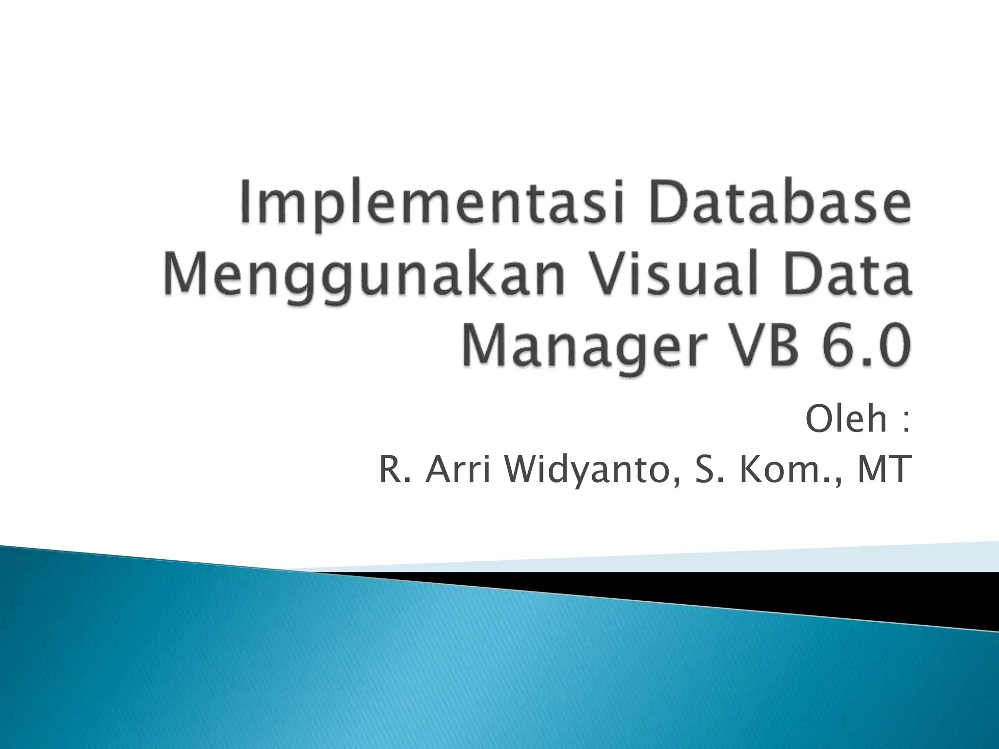 Dokumen ini membahas pengelolaan database menggunakan Visual Basic 6, yang dibagi menjadi back-end dan front-end. Proses pembuatan tabel dalam database dijelaskan secara rinci, termasuk langkah-langkah menggunakan Visual Data Manager dan pengisian data. Selain itu, terdapat instruksi untuk membuat tampilan form dan menjalankan aplikasi.