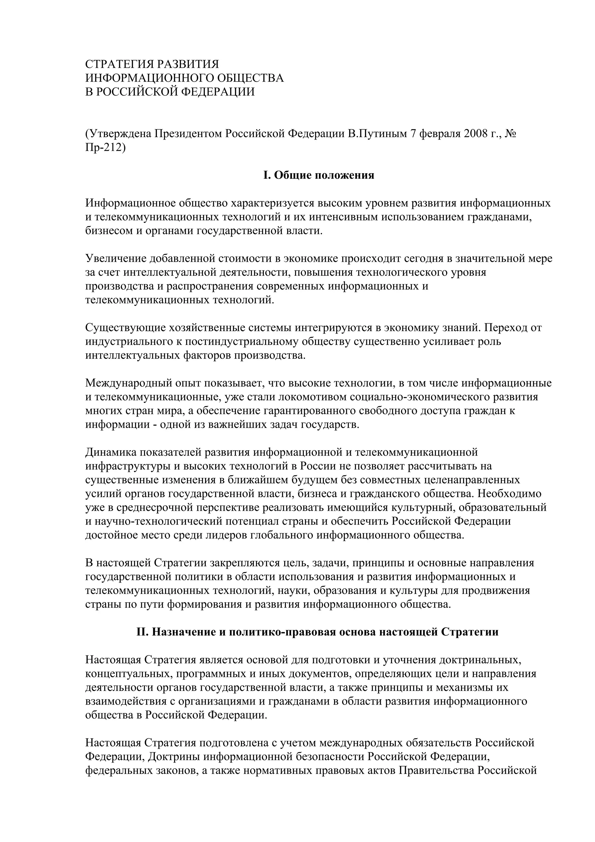 Документ представляет стратегию развития информационного общества в России, утвержденную в 2008 году, с целью повышения качества жизни граждан и конкурентоспособности страны через эффективное использование информационных и телекоммуникационных технологий. Основные направления реализации стратегии включают формирование инфраструктуры, повышение качества образования и медицинских услуг, обеспечение государственных гарантий прав, развитие экономики и культуры, а также усиление международного сотрудничества. Для достижения поставленных задач предусмотрены контрольные показатели и планы мероприятий, включая мониторинг состояния информационного общества.
