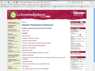 The document discusses managing risks related to information and communication technology (ICT) for organizations. It identifies several types of ICT risks including technology failures, loss or theft of equipment, unauthorized access, and legal noncompliance. It emphasizes the importance of identifying, evaluating, analyzing, and managing these risks through policies, procedures, routine maintenance, backups, disaster recovery plans, and defining roles and responsibilities. Various sources of help are provided for organizations needing assistance with ICT risk assessment, planning, implementation, and review.