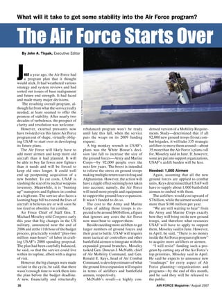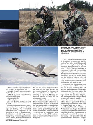 The US Air Force has had to overhaul its program plans due to a number of external pressures. It will likely need to keep more old aircraft and buy fewer new fighters than planned. It also faces higher costs to support an expanded Army and Marine Corps. The Air Force Chief of Staff says the service needs an extra $20 billion annually to maintain readiness and will have to completely rebalance its financial and structural plans. Its top acquisition priorities are replacing the KC-135 tankers, acquiring a new combat search and rescue helicopter, developing new space systems, and procuring F-35 fighters.