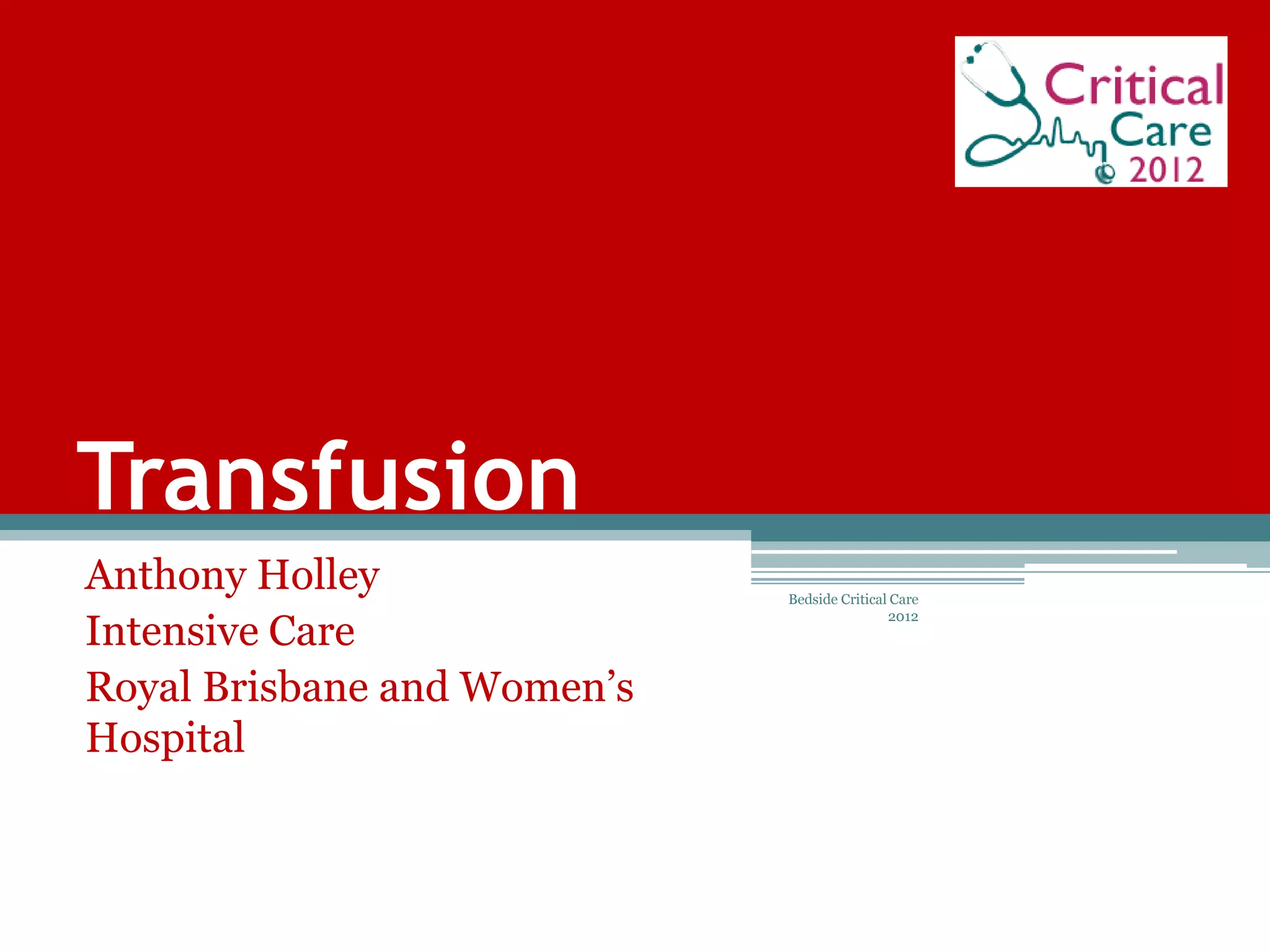 This document discusses transfusion and massive transfusion protocols. It provides a case study of a patient who suffered injuries from a motorcycle accident and received multiple blood transfusions. It then outlines lessons learned, including the importance of massive transfusion protocols, transfusion triggers, transfusion ratios, and the role of tranexamic acid. It recommends hospitals develop massive transfusion protocols and lists critical parameters that should be measured early and frequently for patients receiving massive transfusions, such as temperature, acid-base status, coagulation factors, and hematologic values.