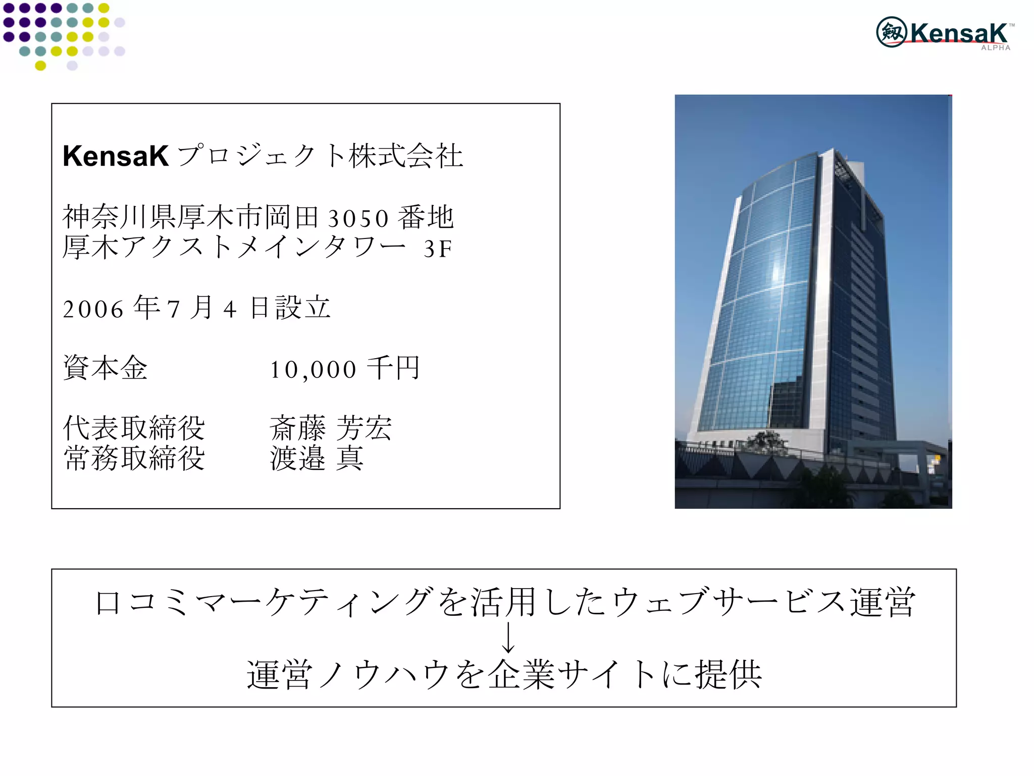 KensaK プロジェクト株式会社 神奈川県厚木市岡田3050 番地 厚木アクストメインタワー 3F 2006 年 7 月 4 日設立 資本金 10,000 千円 代表取締役 斎藤 芳宏 常務取締役 渡邉 真 口コミマーケティングを活用したウェブサービス運営 ↓ 運営ノウハウを企業サイトに提供 - 3.