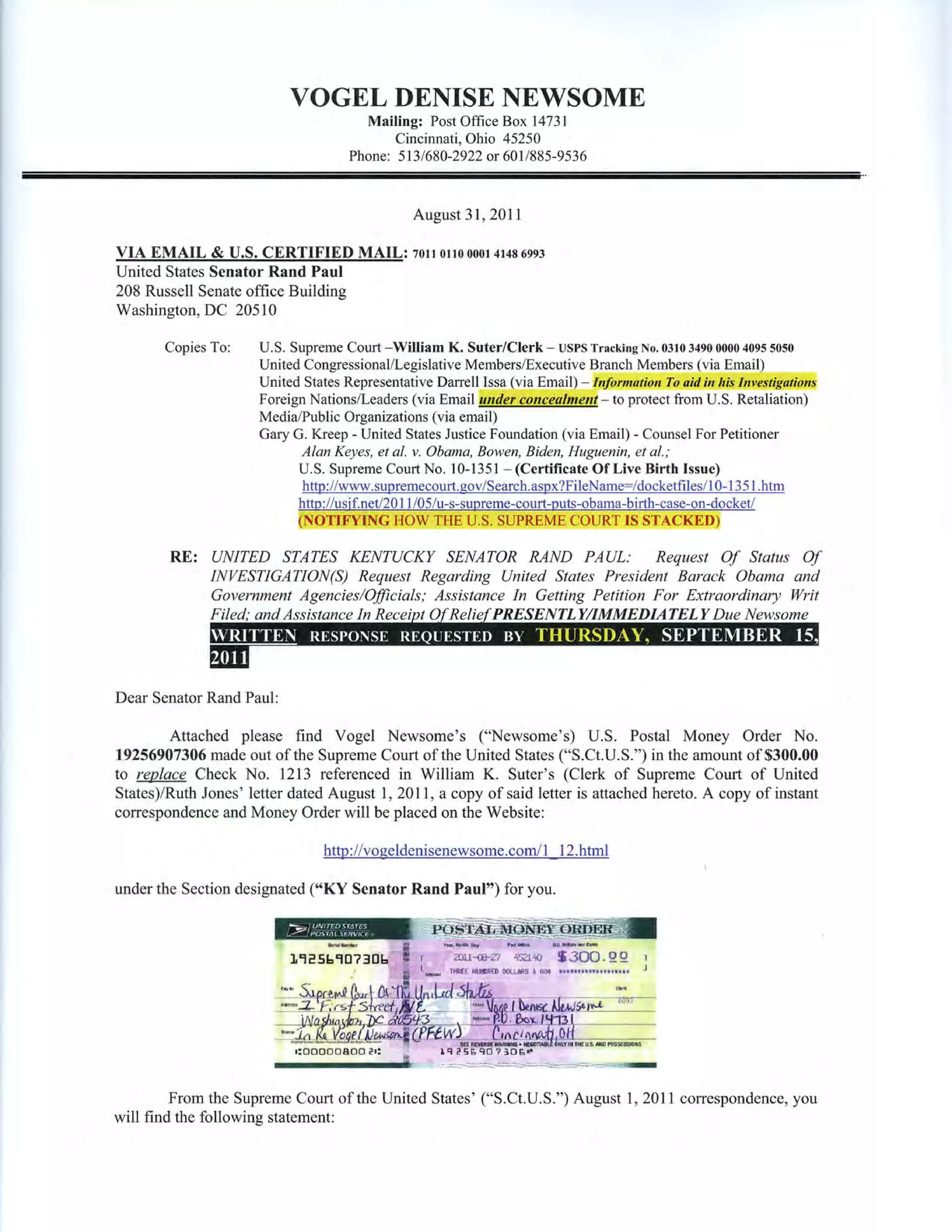 The document is a letter addressed to Senator Rand Paul from constituent Newsome, requesting status updates regarding investigations related to President Barack Obama and assistance with filing a petition for an extraordinary writ. Newsome outlines allegations of obstruction of justice faced while attempting to file her petition and insists on timely responses within specified deadlines. Additionally, the letter includes various claims against legal counsel and judicial entities and highlights concerns about conflicts of interest and misconduct within the courts.