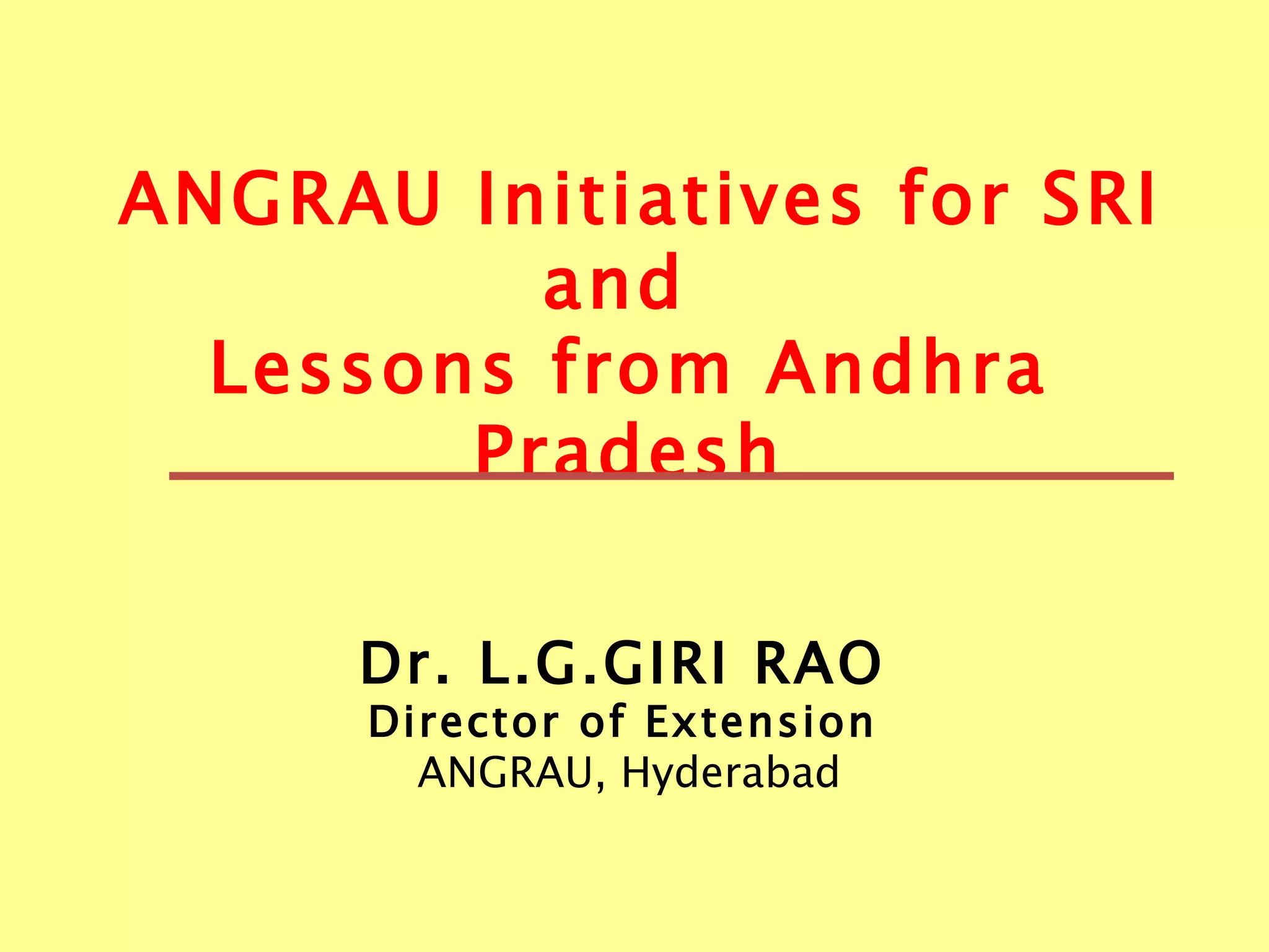 1) The document discusses initiatives by ANGRAU in the Indian state of Andhra Pradesh to promote the System of Rice Intensification (SRI), which can increase rice productivity while reducing water use.