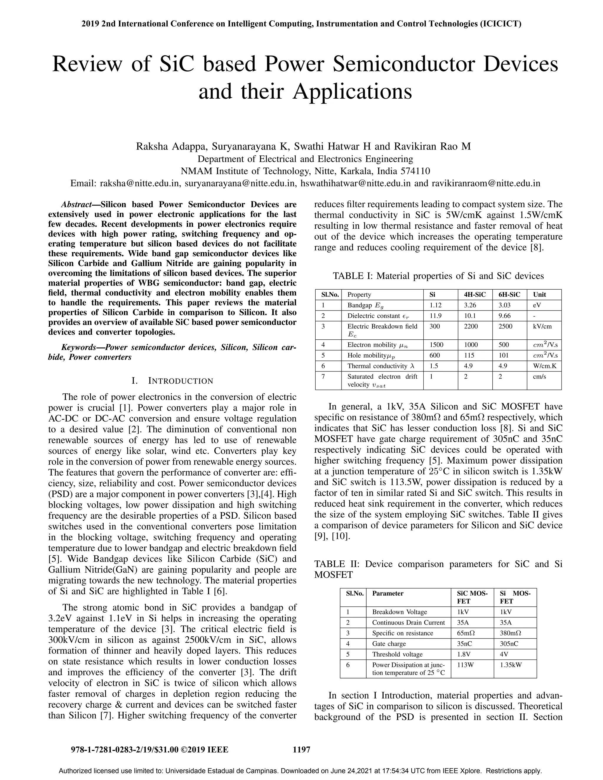 The document reviews silicon carbide (SiC) based power semiconductor devices and their applications. It discusses how the superior material properties of SiC, such as its wide bandgap, high electric field, and high thermal conductivity, allow it to handle higher power ratings, switching frequencies, and operating temperatures compared to silicon-based devices. The document provides an overview of the available SiC power devices, including diodes and MOSFETs, and compares the theoretical advantages of SiC devices to silicon, such as their thinner depletion widths, lower on-state resistances, and higher breakdown voltages. It also briefly discusses potential converter topologies that can benefit from using SiC semiconductor devices.