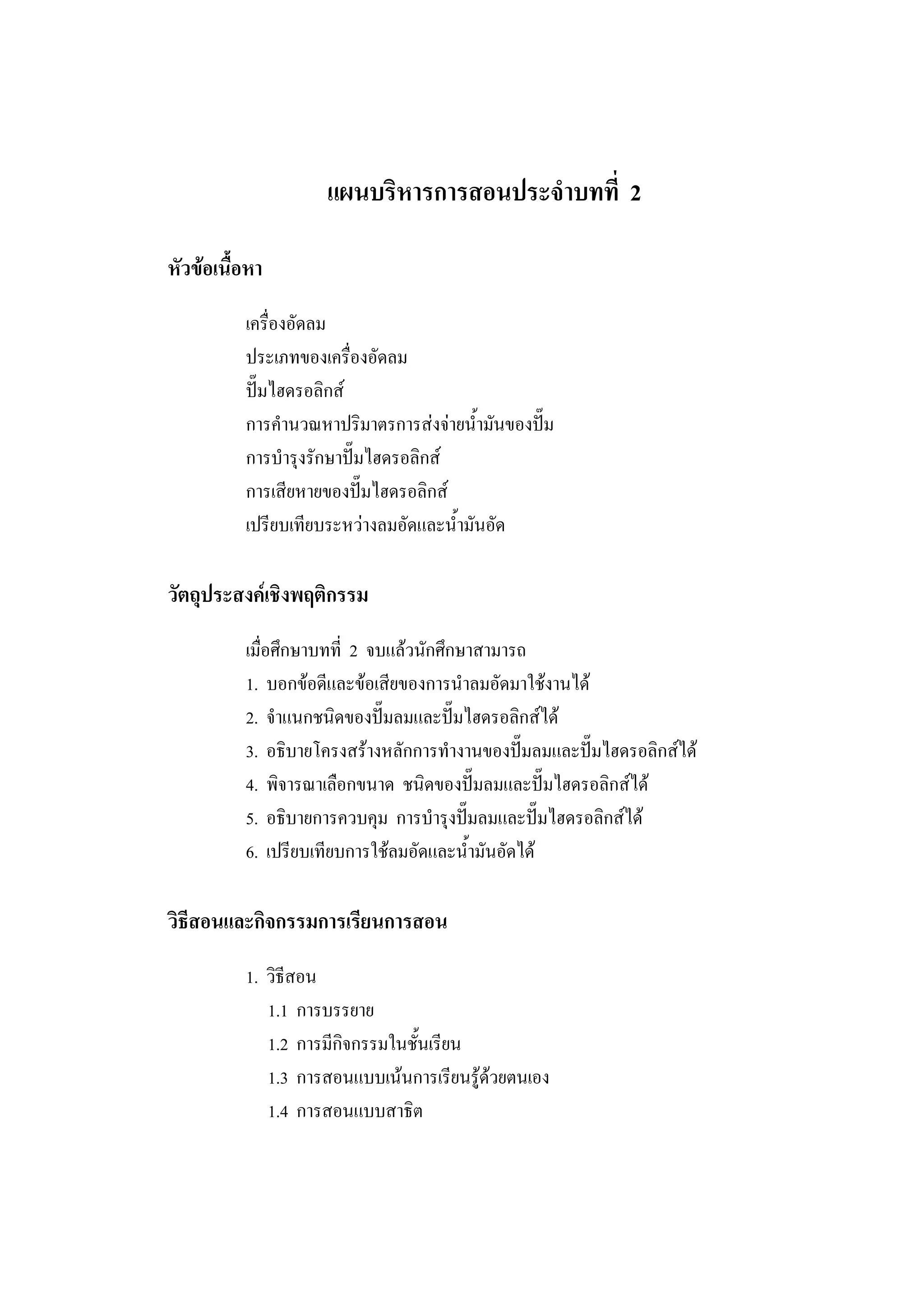 แผนบริหารการสอนประจําบทที่ 2 หัวขอเนื้อหา เครื่องอัดลม ประเภทของเครื่องอัดลม ปมไฮดรอลิกส การคํานวณหาปริมาตรการสงจายน้ํามันของปม การบํารุงรักษาปมไฮดรอลิกส การเสียหายของปมไฮดรอลิกส เปรียบเทียบระหวางลมอัดและน้ํามันอัด วัตถุประสงคเชิงพฤติกรรม เมื่อศึกษาบทที่ 2