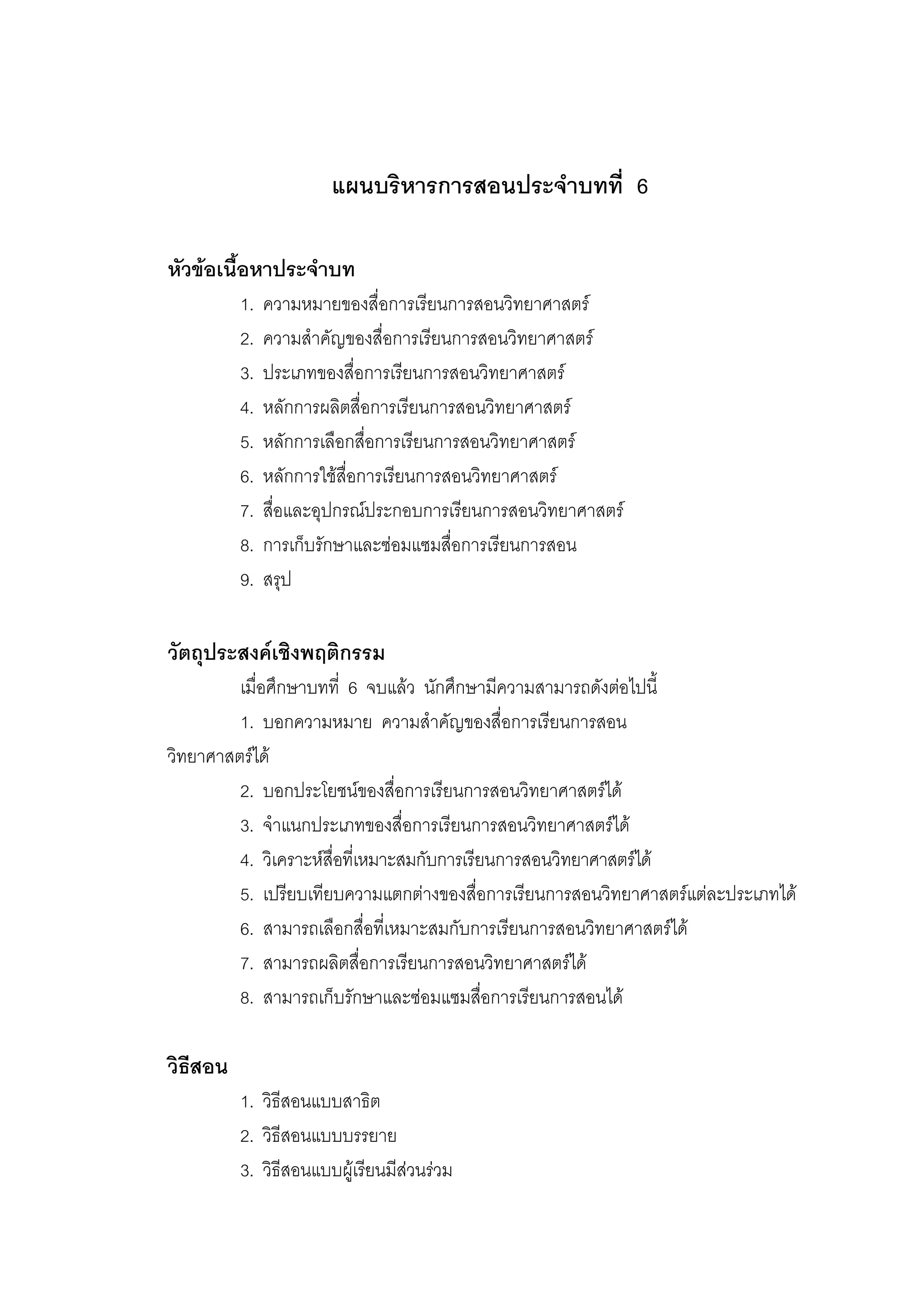 1. ความหมายของสื่อการเรียนการสอนวิทยาศาสตร 2. ความสําคัญของสื่อการเรียนการสอนวิทยาศาสตร 3. ประเภทของสื่อการเรียนการสอนวิทยาศาสตร 4. หลักการผลิตสื่อการเรียนการสอนวิทยาศาสตร 5. หลักการเลือกสื่อการเรียนการสอนวิทยาศาสตร 6. หลักการใชสื่อการเรียนการสอนวิทยาศาสตร 7. สื่อและอุปกรณประกอบการเรียนการสอนวิทยาศาสตร 8. การเก็บรักษาและซอมแซมสื่อการเรียนการสอน 9. สรุป วัตถุประสงคเชิงพฤติกรรม เมื่อศึกษาบทที่ 6 จบแลว นักศึกษามีความสามารถดังตอไปนี้ 1. บอกความหมาย ความสําคัญของสื่อการเรียนการสอน วิทยาศาสตรได 2. บอกประโยชนของสื่อการเรียนการสอนวิทยาศาสตรได 3. จําแนกประเภทของสื่อการเรียนการสอนวิทยาศาสตรได 4. วิเคราะหสื่อที่เหมาะสมกับการเรียนการสอนวิทยาศาสตรได 5. เปรียบเทียบความแตกตางของสื่อการเรียนการสอนวิทยาศาสตรแตละประเภทได 6. สามารถเลือกสื่อที่เหมาะสมกับการเรียนการสอนวิทยาศาสตรได 7. สามารถผลิตสื่อการเรียนการสอนวิทยาศาสตรได 8. สามารถเก็บรักษาและซอมแซมสื่อการเรียนการสอนได วิธีสอน 1. วิธีสอนแบบสาธิต 2. วิธีสอนแบบบรรยาย 3. วิธีสอนแบบผูเรียนมีสวนรวม