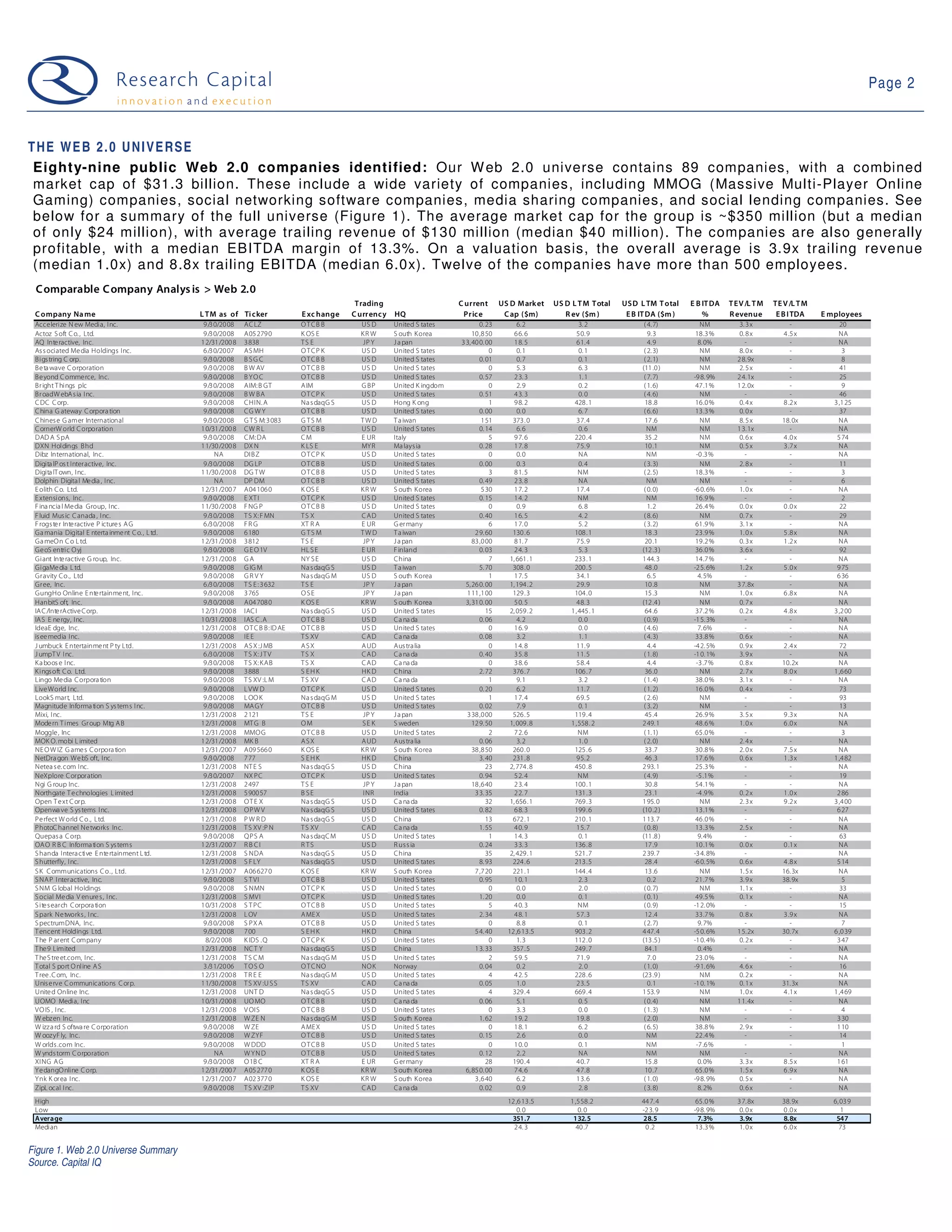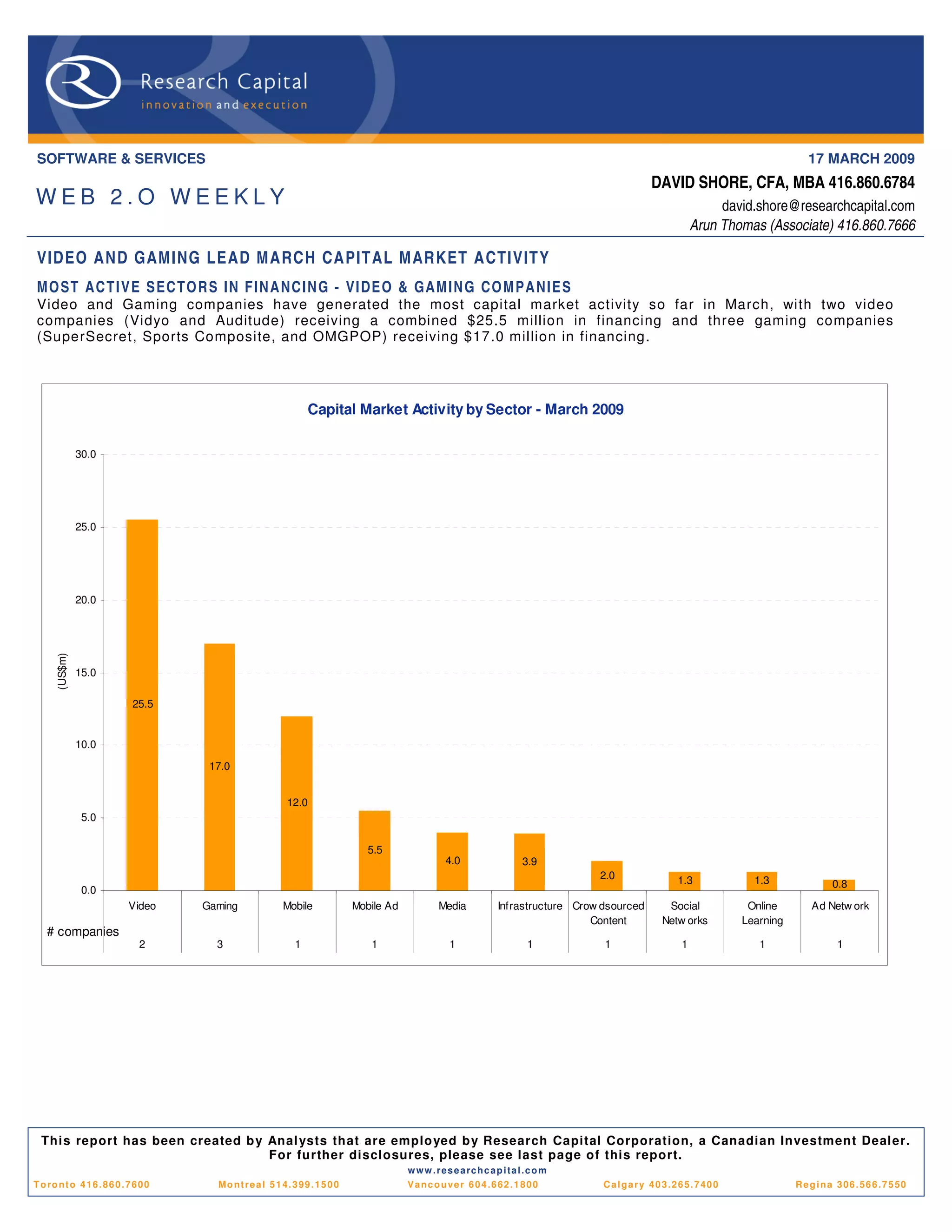 Video and gaming companies received the most capital market financing in March 2009. Two video companies received $25.5 million and three gaming companies received $17 million. The report also identifies 89 public web 2.0 companies with a total market cap of $31.3 billion across a wide range of sectors including gaming, social networking, media sharing, and social lending. On average, these companies have $350 million in market cap and $130 million in annual revenue.
