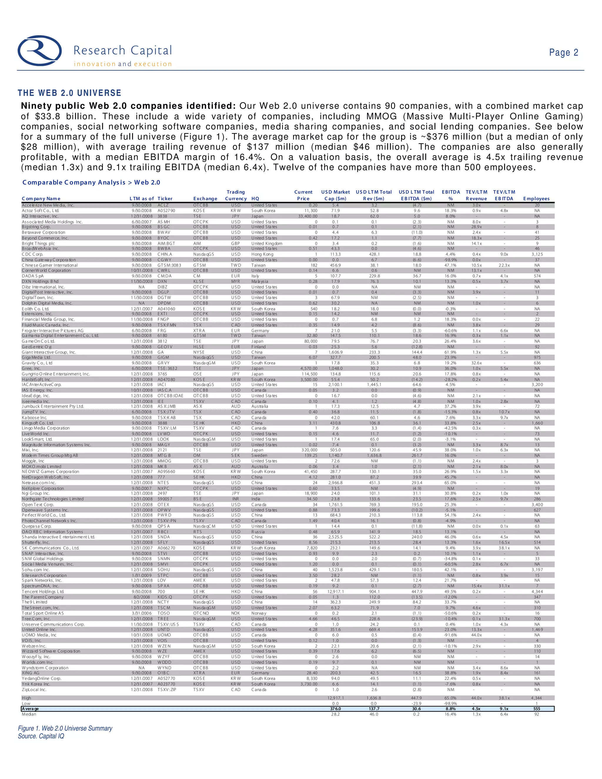 This report summarizes the recent financial results of several public Web 2.0 companies. Tencent Holdings reported the highest revenue growth at 90% for the full year. MOKO.mobi reported the worst performance with revenue dropping almost 60% year-over-year. The report tracks 90 public Web 2.0 companies with a combined market cap of $33.8 billion and provides an analysis of their financials including revenue, EBITDA, employees and valuation metrics.