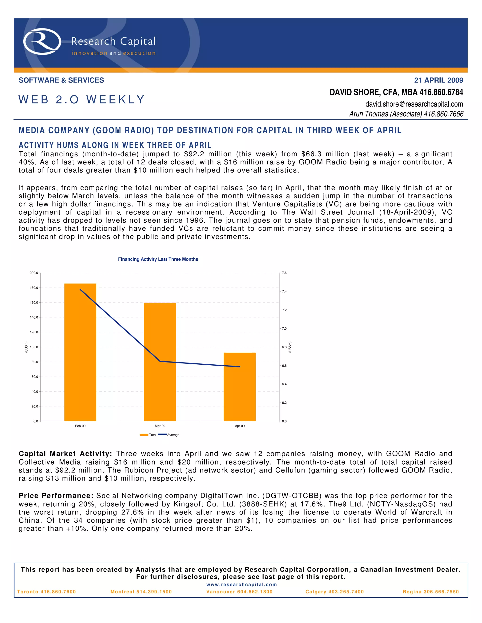 In the third week of April 2009, total financing in the software and services sector rose to $92.2 million, largely driven by significant raises from companies like Goom Radio and Collective Media. Despite this uptick, venture capital activity remains cautious, with reports indicating a drop to levels not seen since 1996 due to reluctance from traditional funding sources. The analysis of the 92 public Web 2.0 companies reveals a combined market cap of approximately $40 billion, with generally profitable characteristics and varying valuation metrics.