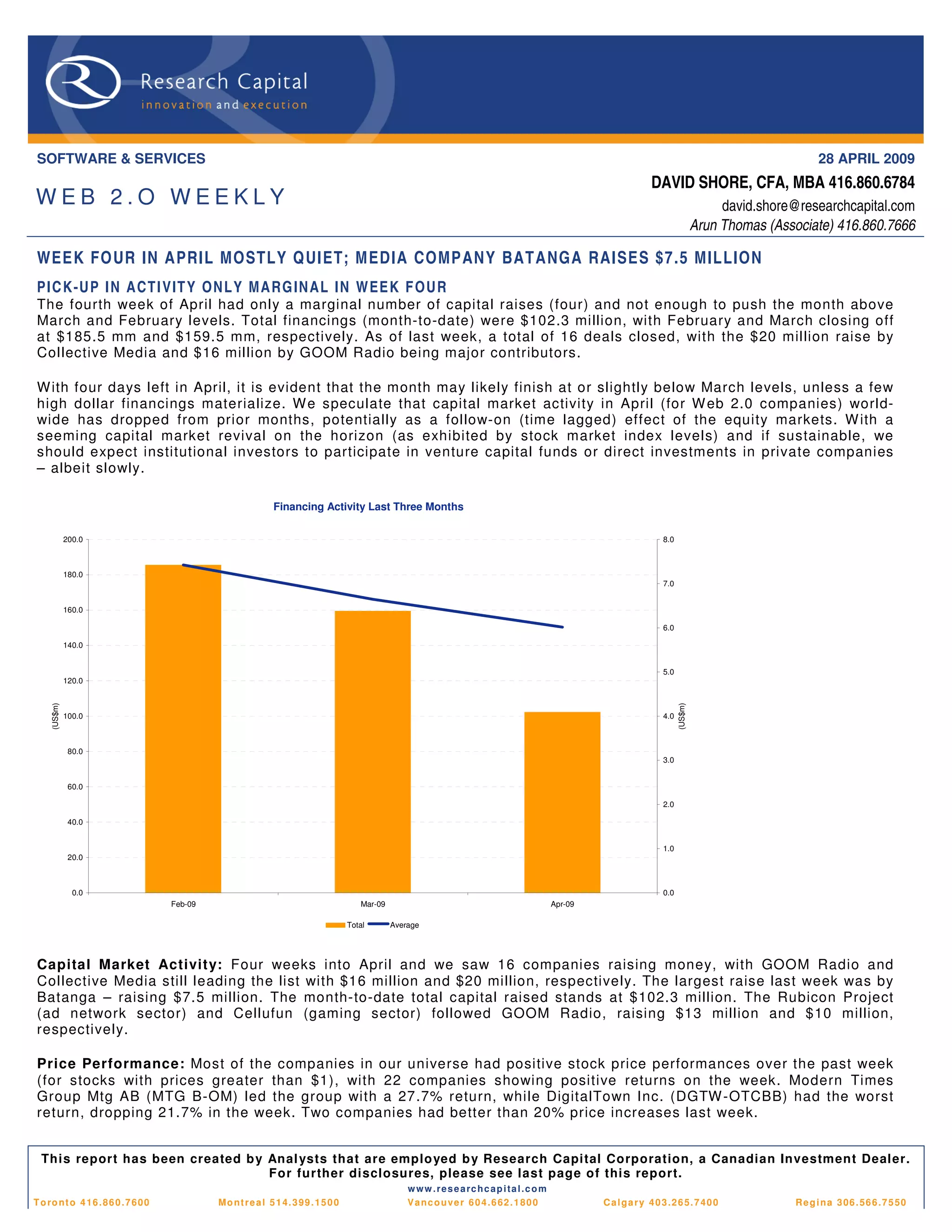In April 2009, web 2.0 capital market activity was subdued with only four capital raises totaling $102.3 million, compared to higher totals in previous months. Key raises included $20 million by Collective Media and $16 million by Goom Radio, though overall financing levels fell short of expectations. A total of 92 public web 2.0 companies were identified, cumulatively valued at approximately $41 billion, with positive stock performances for many companies despite decreased activity.
