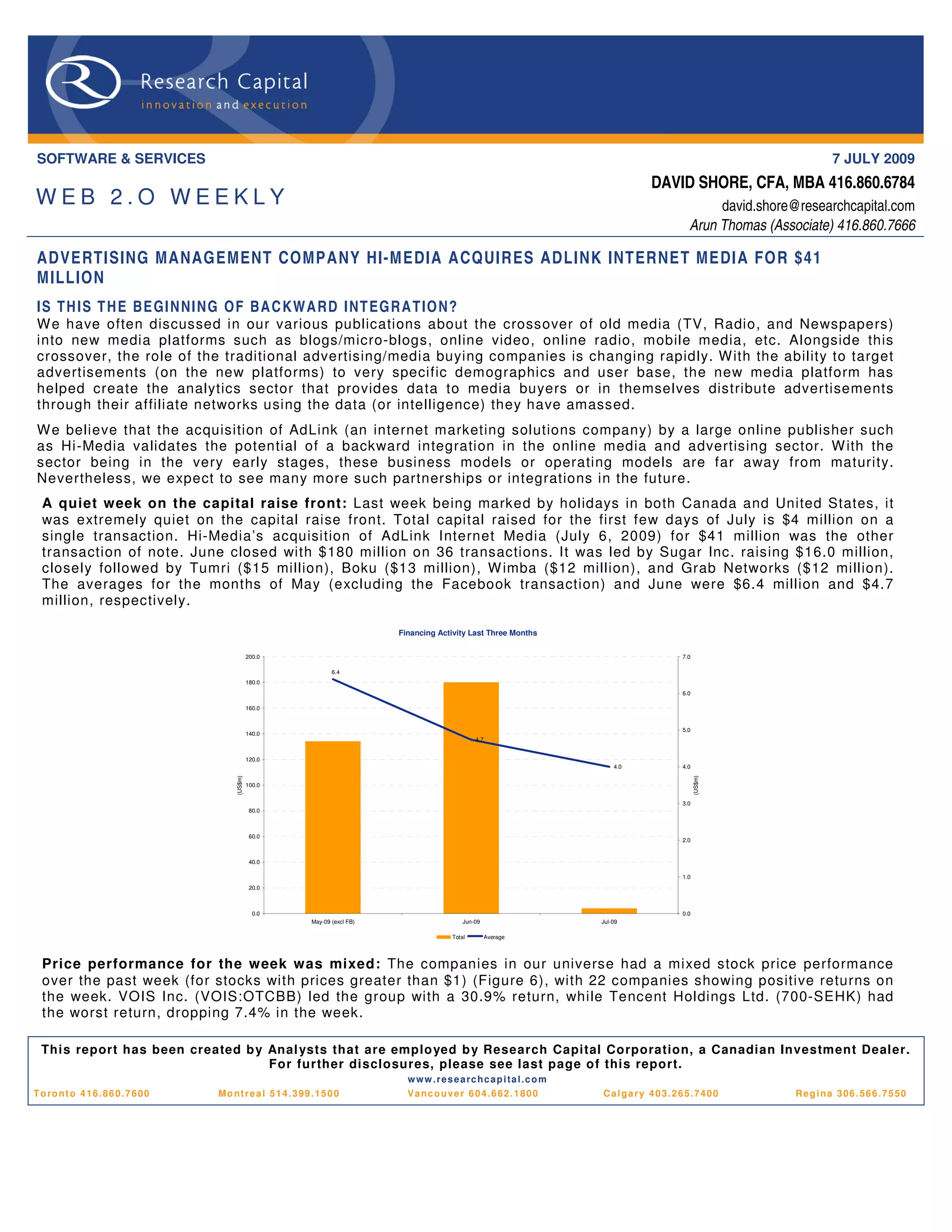 - Hi-Media, a large online publisher, acquired AdLink Internet Media, an internet marketing solutions company, for $41 million. This validates the potential for "backward integration" in the online media and advertising sector.