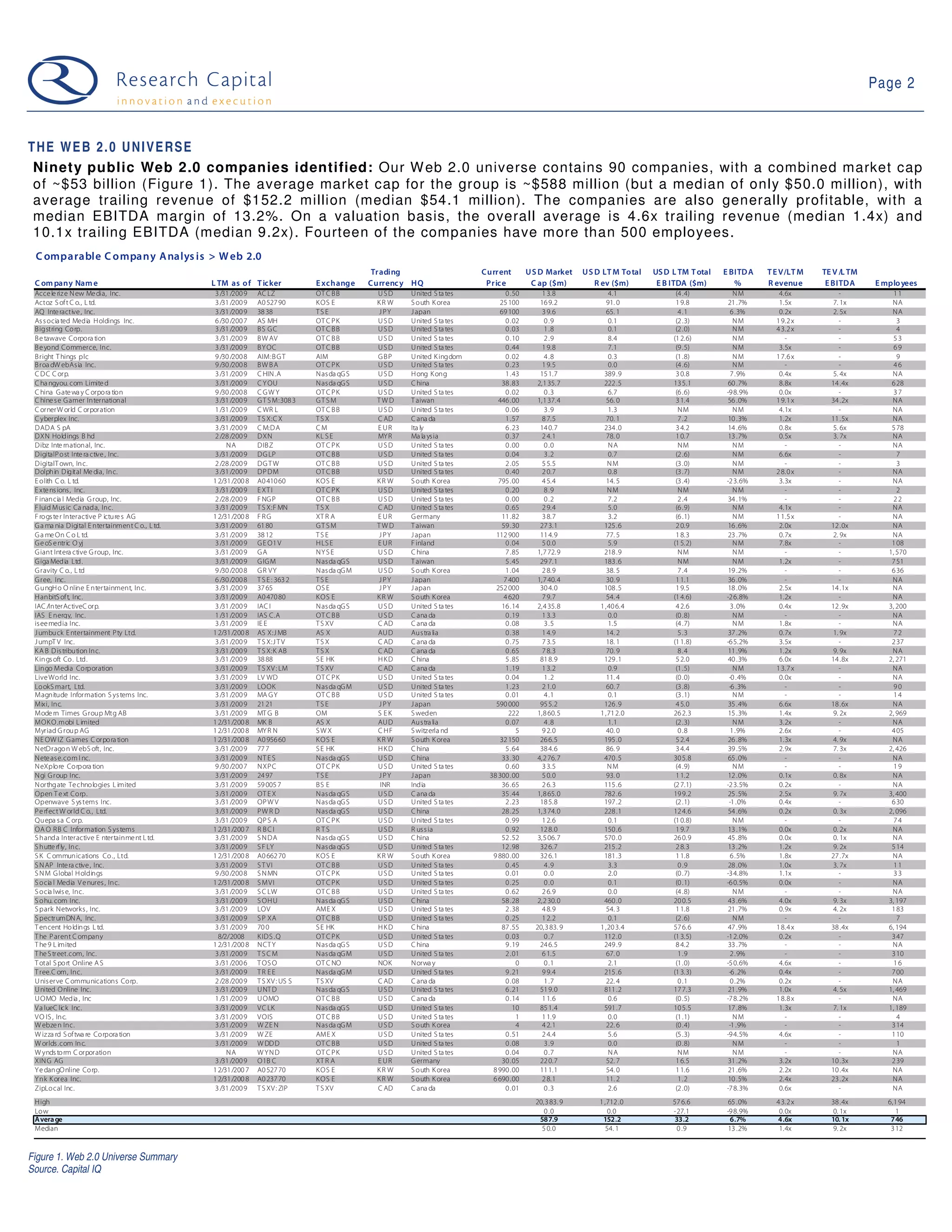 - The document analyzes 90 public web 2.0 companies, finding an average market cap of $588 million, revenue of $152.2 million, and EBITDA margin of 13.2%. Valuations average 4.6x revenue and 10.1x EBITDA.