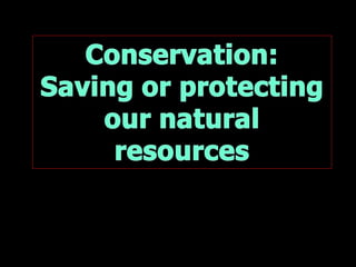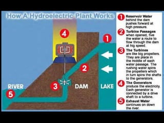 The document discusses various energy resources including fossil fuels like coal, petroleum, and natural gas which are non-renewable. It also discusses renewable resources for generating electricity such as hydroelectric, geothermal, wind, solar, nuclear, and biomass. For each type of energy source, it provides some background on how it works and highlights potential advantages and disadvantages.