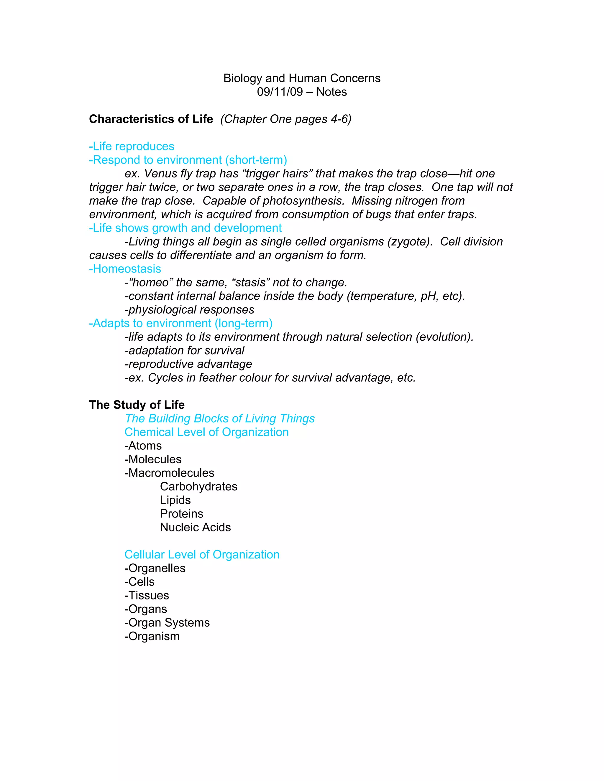 The document summarizes key characteristics of life and levels of biological organization. It outlines that life reproduces, responds to and adapts to its environment, shows growth and development, and maintains homeostasis. It also describes the building blocks of living things from atoms to macromolecules to cellular organization. Finally, it notes that all life uses DNA to store and inherit genetic information across generations.