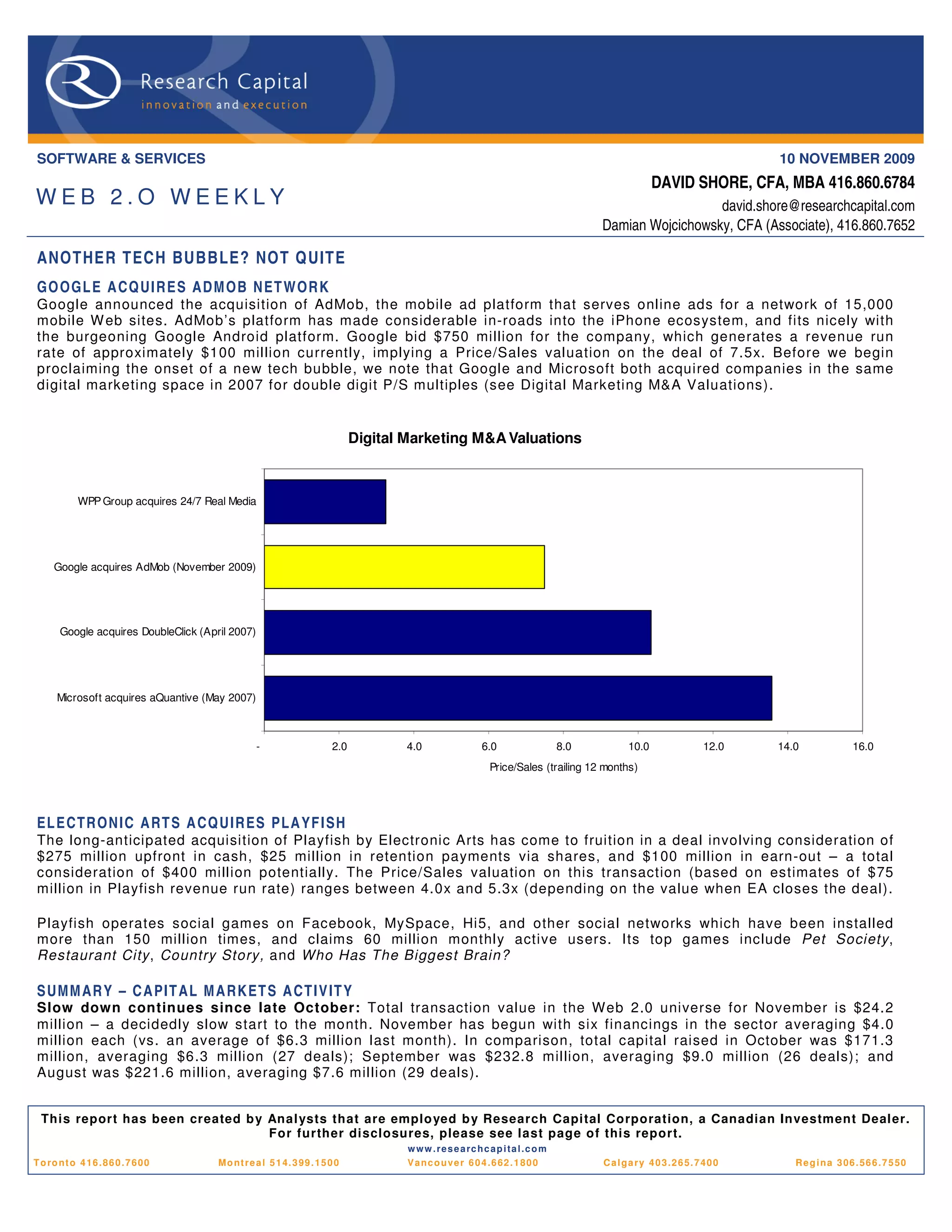Google acquired AdMob, a mobile ad network, for $750 million. This implies a price to sales valuation of 7.5x for AdMob, which has annual revenue of around $100 million. Electronic Arts acquired social gaming company Playfish for up to $400 million, valuing Playfish at between 4-5.3x its estimated annual revenue of $75 million. Capital market activity in the Web 2.0 sector slowed in November, with total funding so far at $24.2 million from six deals averaging $4 million each, down from previous months.