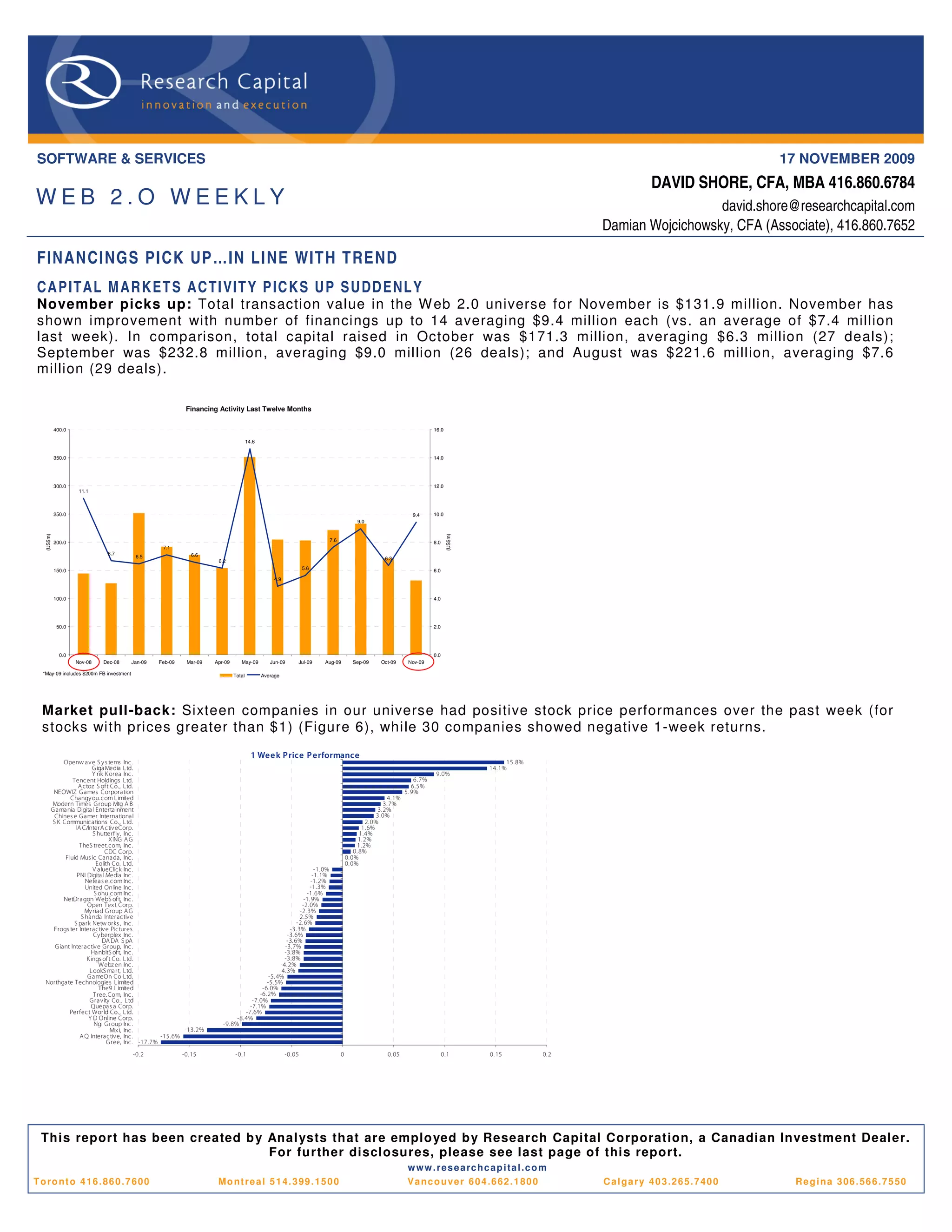 - November saw an increase in financing activity for Web 2.0 companies, with 14 deals totaling $131.9 million, up from previous months. The average deal size was $9.4 million.
