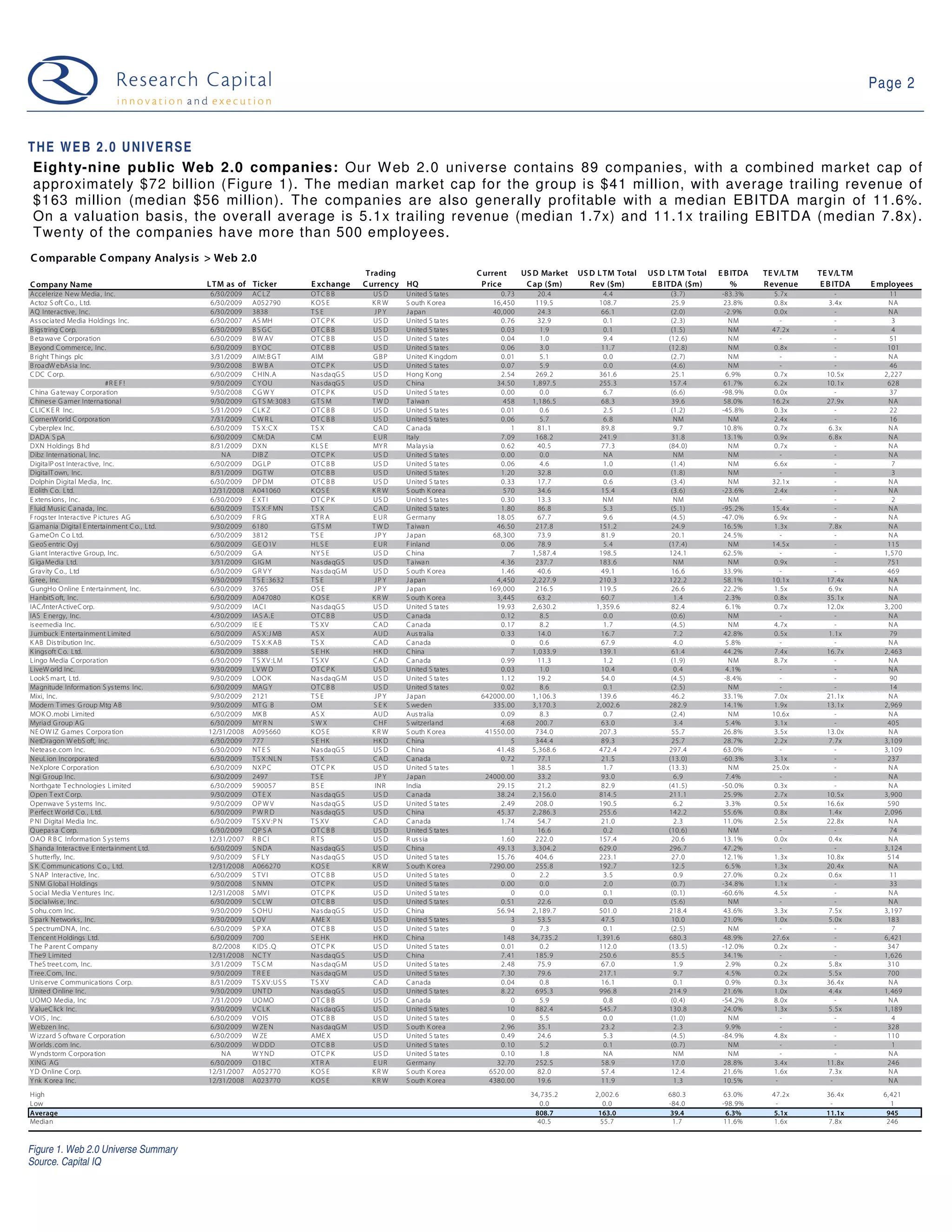 - The document analyzes valuation metrics for several Web 2.0 companies, finding average valuations of 5.1x trailing revenue and 11.1x trailing EBITDA across the sector.