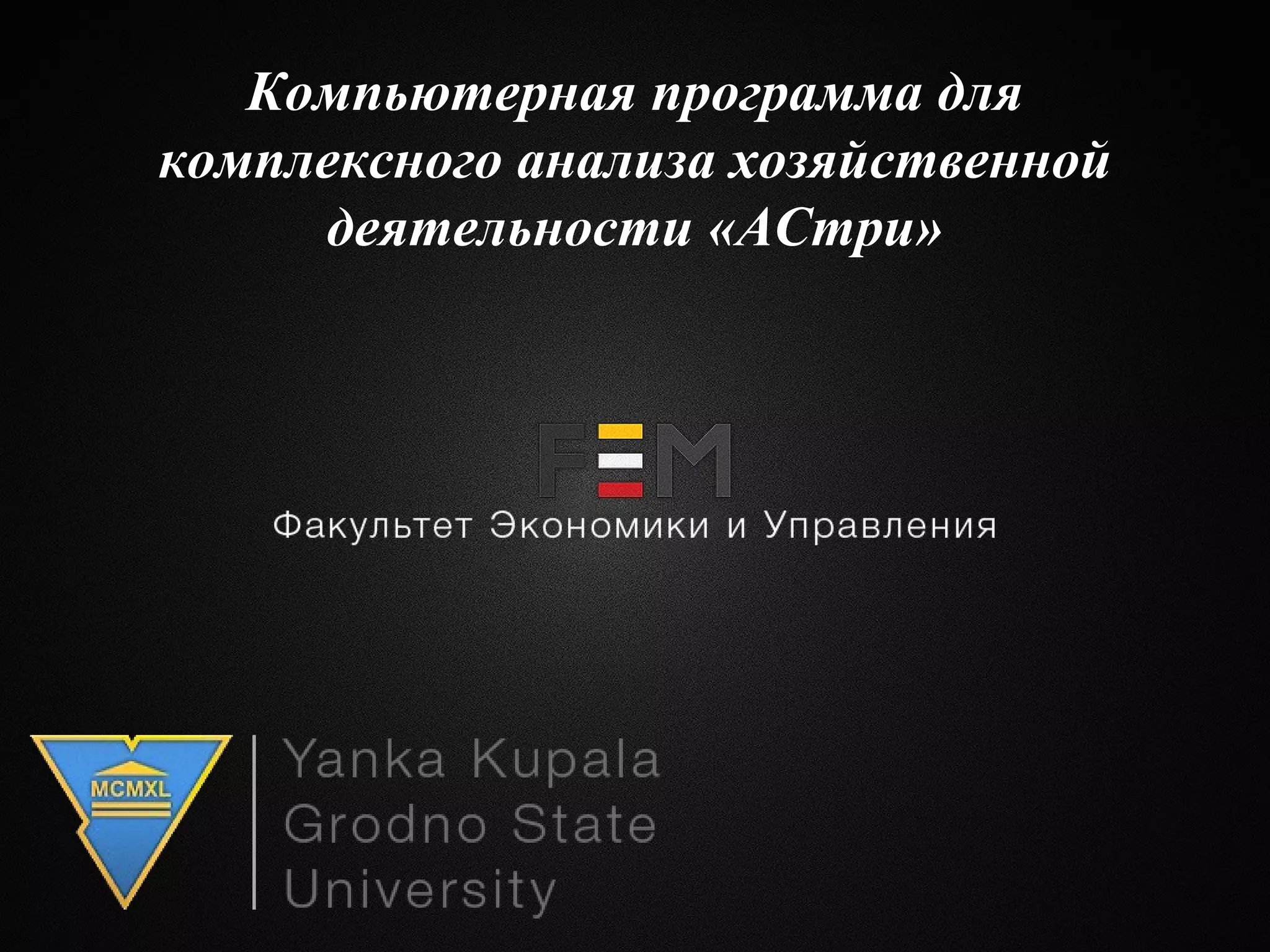 Документ описывает возможности компьютерной программы 'Астри' для комплексного анализа хозяйственной деятельности, включая анализ производства, персонала, основных средств и финансовых результатов. Программа позволяет проводить автоматический расчет показателей, факторный анализ и строить графики для интерпретации данных. Приведены ключевые финансово-экономические показатели за первый год реализации проекта, такие как себестоимость продукции, чистая прибыль и рентабельность продаж.