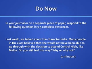 This document contains the lesson plan and assignments for an English class. It includes instructions for students to respond to a journal prompt about the character India from last week's reading. It defines the NAACP and summarizes the Supreme Court case Brown v. Board of Education. It provides discussion questions to have students summarize chapters 4-6 of the book. It also lists vocabulary and comprehension activities, including having students complete a vocabulary window with the assigned words and taking quizzes on Friday to assess their understanding.