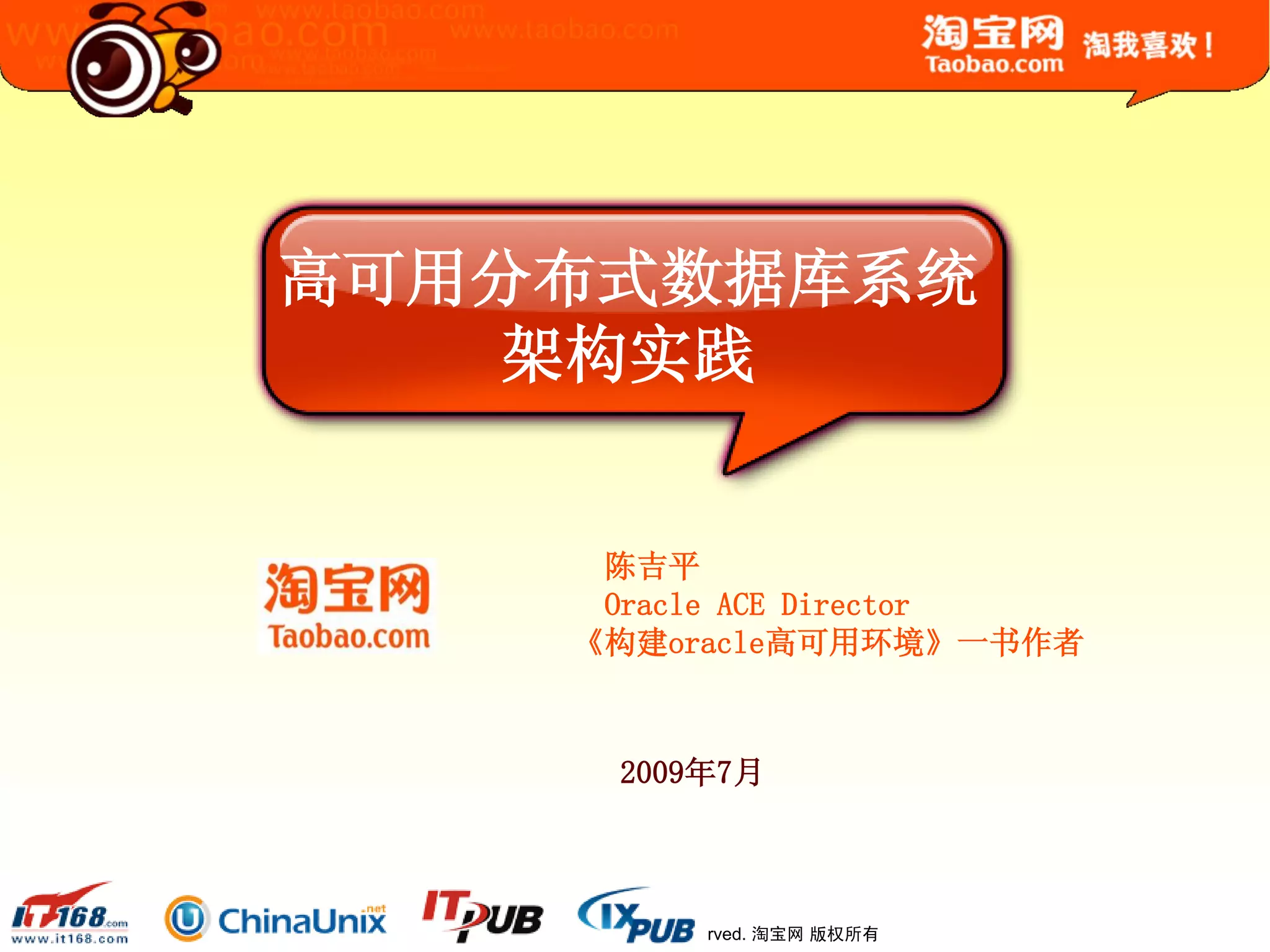 文档回顾了淘宝网的发展历程及其数据库架构的演变,强调了高可用分布式数据库系统的重要性和建设方法。主要内容包括淘宝的技术演变,从LAMP架构到分布式存储及缓存,最后实现读写分离和水平分割以提升性能和扩展性。总结指出,数据库技术需结合实际业务需求,并强调监控系统的重要性。