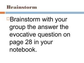 The document discusses geologic principles for understanding the Earth's history. Students are asked to brainstorm how these principles are like a layer cake. The principles discussed are uniformitarianism, superposition, original horizontality, and catastrophism. For each principle, students come up with a simile comparing it to a layer cake and illustrate it. They then answer the evocative question of how the geologic principles are like a layer cake by brainstorming as a group.