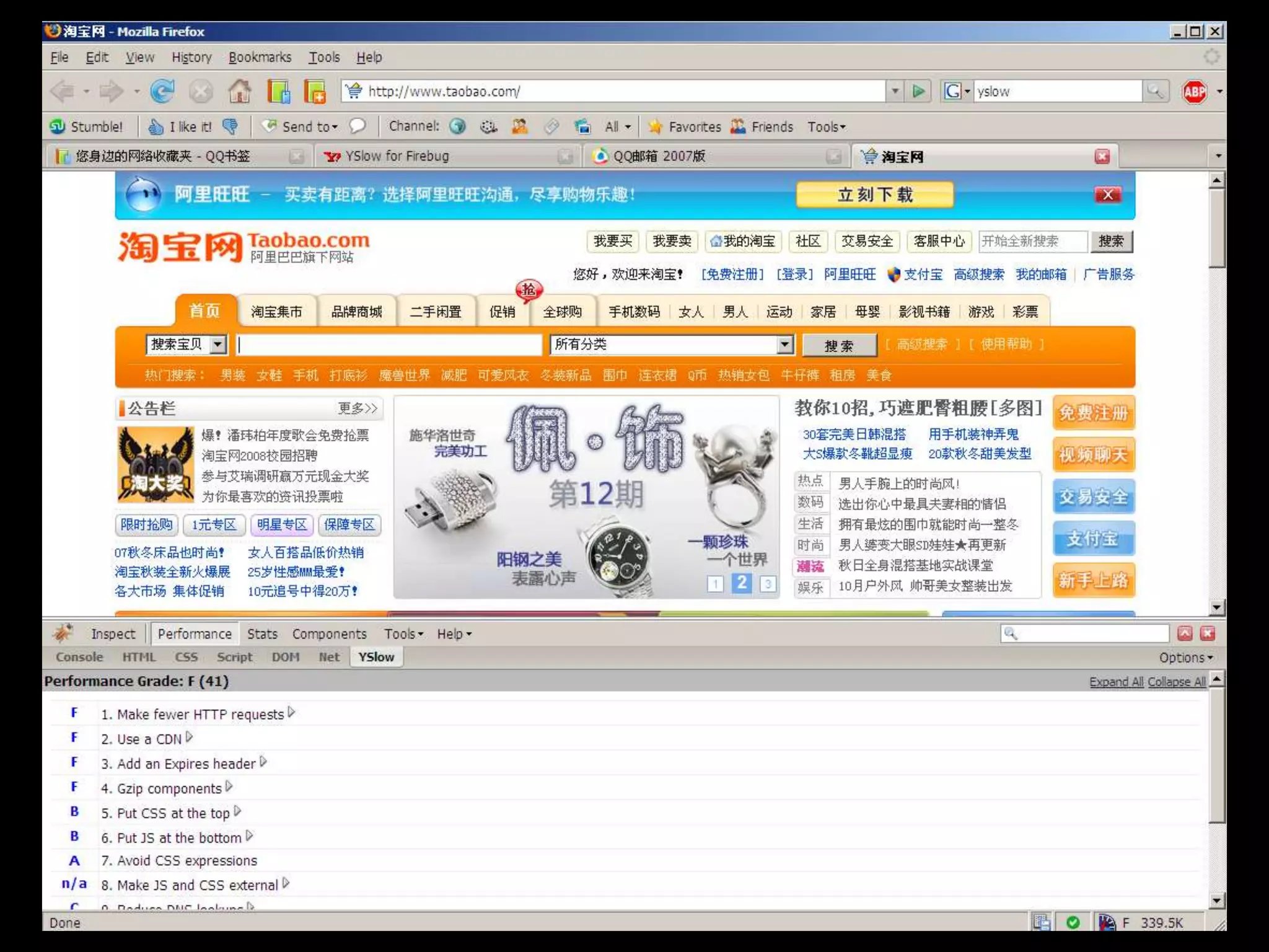 The document discusses techniques for optimizing front-end web performance. It provides examples of how much time is spent loading different parts of top websites, both with empty caches and full caches. The "performance golden rule" is that 80-90% of end-user response time is spent on the front-end. The document also outlines Yahoo's 14 rules for performance optimization, which include making fewer HTTP requests, using content delivery networks, adding Expires headers, gzipping components, script and CSS placement, and more.