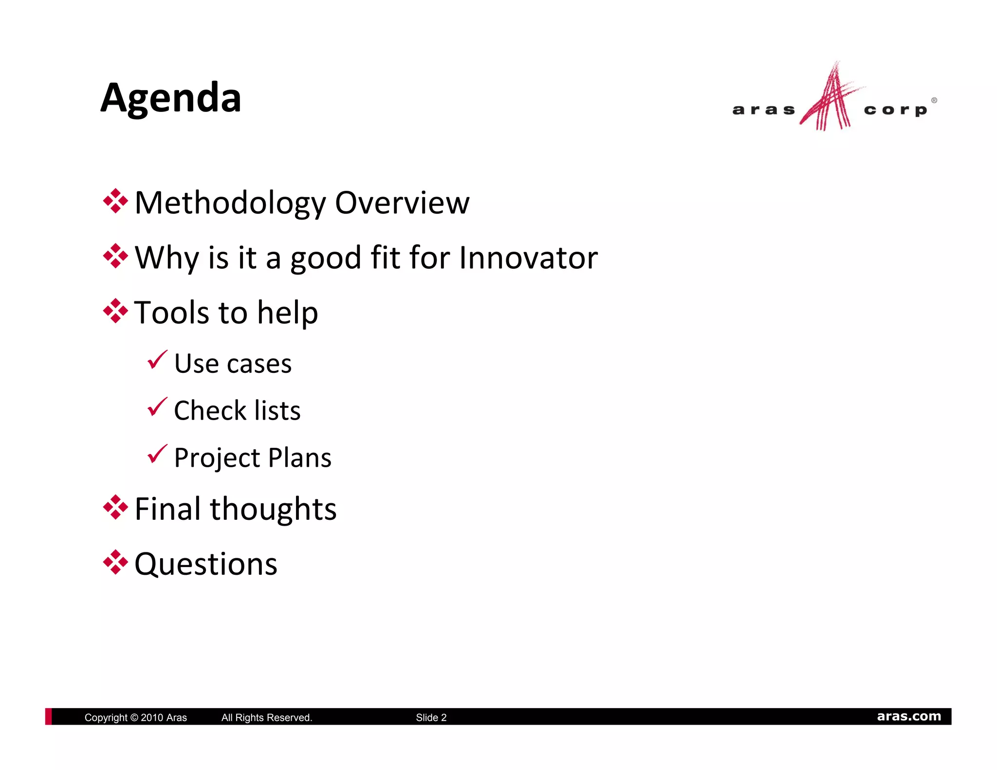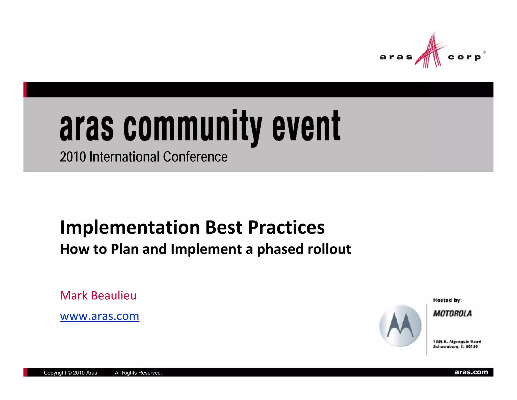 The document discusses best practices for implementing a phased rollout using the Rational Unified Process (RUP) methodology. It provides an overview of RUP, which uses an iterative approach to develop solutions in increments. Each phase of RUP - inception, elaboration, construction, and transition - is described. The document also outlines how RUP's iterative development process and disciplines like requirements and testing align well with using Aras Innovator. An example project is given for product engineering using Aras Innovator to manage parts, documents, bills of materials, and changes.