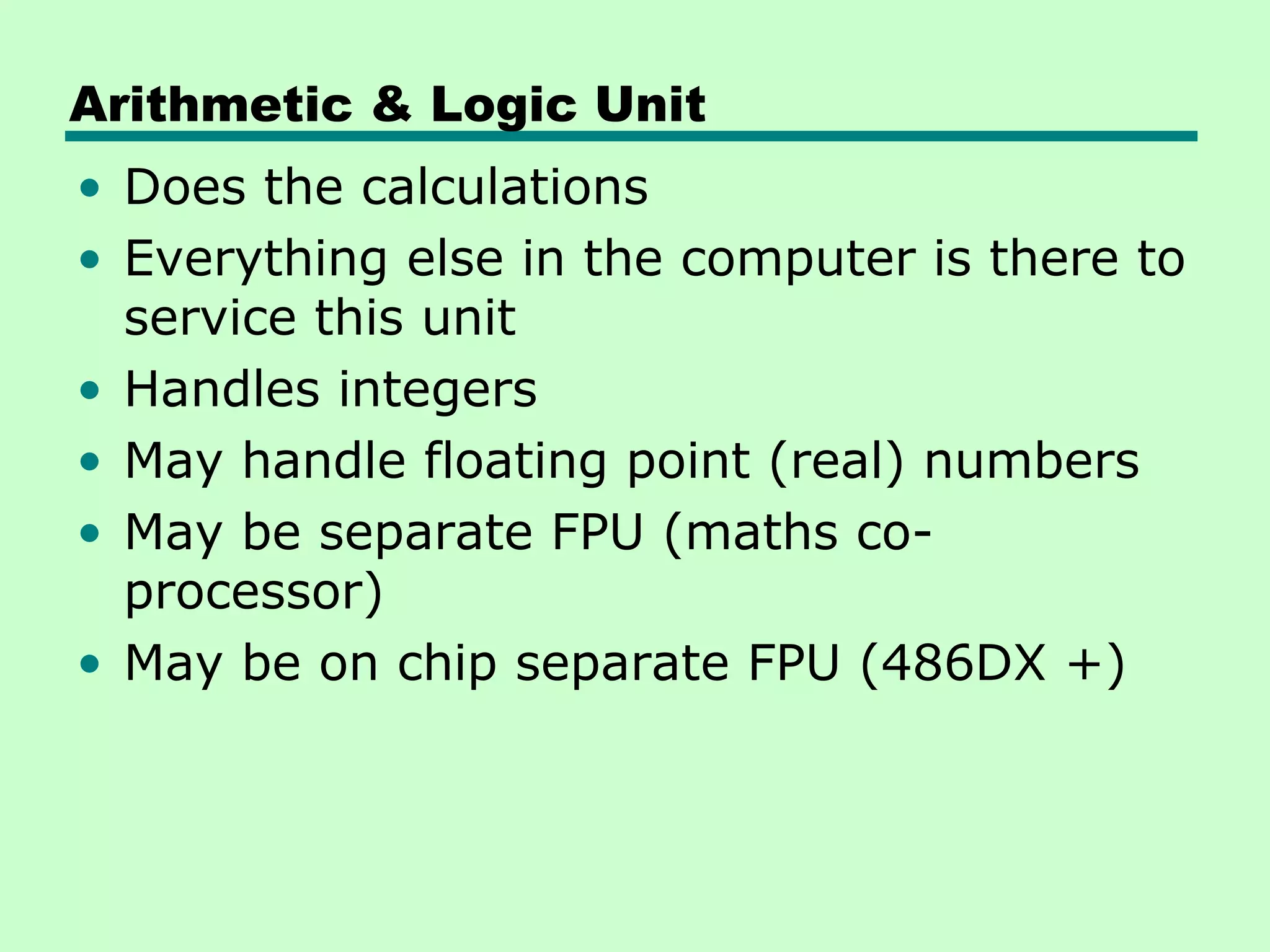 1) The ALU handles integer and floating point calculations. It may have a separate floating point unit.