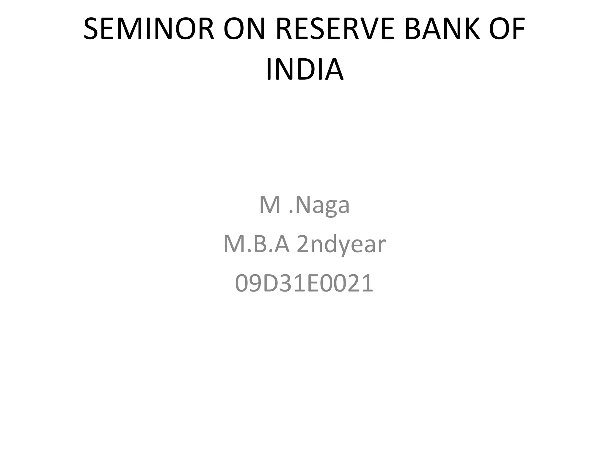 The Reserve Bank of India is the central bank of India, established in 1935. It has four regional representations located in New Delhi, Chennai, Kolkata, and Mumbai. The RBI has various tools to control monetary policy, which include the bank rate, cash reserve requirements, and statutory liquidity requirements. The RBI performs key functions such as monetary authority, manager of exchange control, issuer of currency, and developmental role to support national objectives.