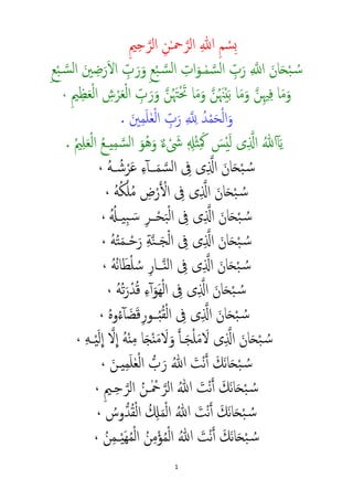 ِْﺴ��اﻟﺮ ِﻦٰـﲪِﲓِﺣ ٰﻤ �ﺴﻟا ِّبَر ِ ��ا َﺎنَ�ْﺒ ُ�ﺳِﻊْﺒ ��ﺴﻟا َﲔ ِﺿَرَﻻا ِّبَرَو ِﻊْﺒ ��ﺴﻟا ِاتَـﻮ ِﲓِﻈَﻌْﻟا ِشْﺮَﻌْﻟا ِّبَرَو �ﻦُ َﳤَْﲢ ﺎَﻣَو �ﻦُ َﳯْيَﺑ ﺎَﻣَو �ﻦِﳱِﻓ ﺎَﻣَو، ٰﻌْﻟا ِّبَر ِ � ِ� ُﺪْﻤَﺤْﻟاَوَﲔِﻤَﻠ. َﻳٓآُﷲِ ��اىٖ ِ�ْﺜَِﳈ َﺲْيَﻟْ َﳽيِﻤ �ﺴﻟا َُﻮﻫَو ٌءـُﲓِﻠَﻌْﻟا ُﻊ. ِﰱ ىِ ��ا َﺎنَ�ْﺒ ُ�ﺳَﻤ �ﺴﻟاـٓآِءُﺷْﺮَﻋـُﻪ، َﺎنَ�ْﺒ ُ�ﺳِضْر� ْ�ا ِﰱ ىِ ��اُﻜْﻠُﻣُﻪ، َﺎنَ�ْﺒ ُ�ﺳِﰱ ىِ ��اْﻟاْﺤَﺒــِﺮيِﺒ َ�ﺳـُُ�، َﺎنَ�ْﺒ ُ�ﺳَﺠۡﻟا ِﰱ ىِ ��اـِﺔ�ﻨْﺣَرـُﺘَﻤُﻪ، َﺎنَ�ْﺒ ُ�ﺳِﰱ ىِ ��اِرـﺎ�ناﻟُﻧﺎَﻄْﻠ ُﺳُﻪ، َﺎنَ�ْﺒ ُ�ﺳِﰱ ىِ ��اََﻮﻬْﻟآآُﺗَرْﺪُﻗ ِءُﻪ، َﺎنَ�ْﺒ ُ�ﺳْﻟا ِﰱ ىِ ��اُﻘُبــِرﻮَﻀَﻗٓآوُءُﻩ، ا َﺎنَ�ْﺒ ُ�ﺳَﺠْﻠَﻣ َﻻ ىِ ����أَ�ْنَﻣ َﻻَوْيَﻟ � ا �ﻻ � ا ُﻪْنِﻣ ﺎـِﻪ، َﻧﺎَ�ْﺒ ُ�ﺳَﻚَﺖْﻧ�أُﷲَر�بَيـﻦِﻤَﻠٰﻌْﻟا، َﻧﺎَ�ْﺒ ُ�ﺳَﻚَﺖْﻧ�أُﷲ�اﻟﺮٰ ْﲪُـﻦ�اﻟﺮِ�ﲓِﺣ، َﻧﺎَ�ْﺒ ُ�ﺳَﻚَﺖْﻧ�أُﷲُوس�ﺪُﻘْﻟا ُ ِ�َﻤْﻟا، َﻧﺎَ�ْﺒ ُ�ﺳَﻚَﺖْﻧ�أُﷲْيَﻬُﻤْﻟا ُﻦِﻣْﺆُﻤْﻟاـُﻦِﻤ،