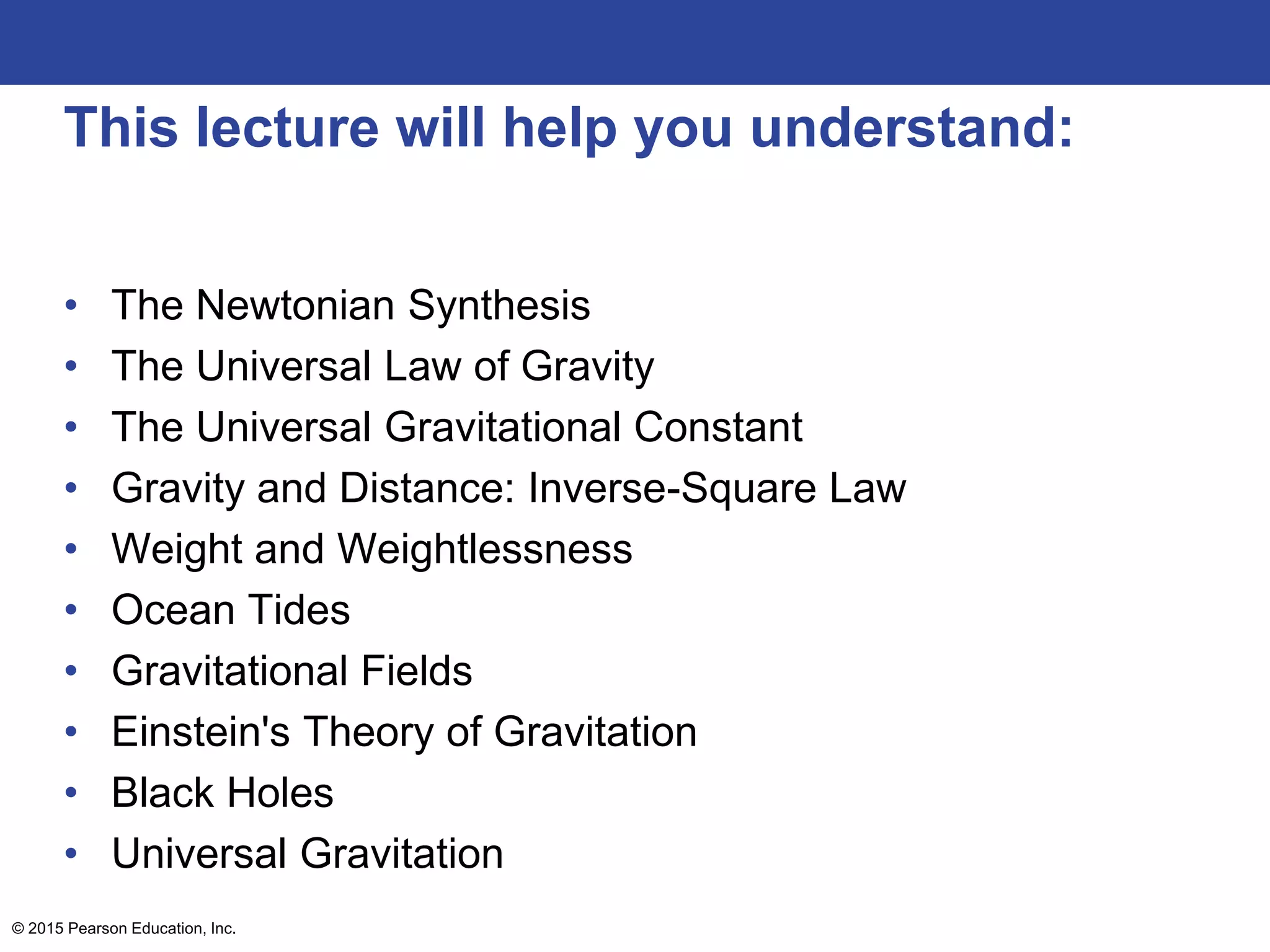 This lecture outline covers key concepts of gravity including Newton's universal law of gravity, the inverse square law, gravitational fields, weight and weightlessness, ocean tides, black holes, and Einstein's theory of gravitation. The key topics are explained through definitions, equations, diagrams, and examples.