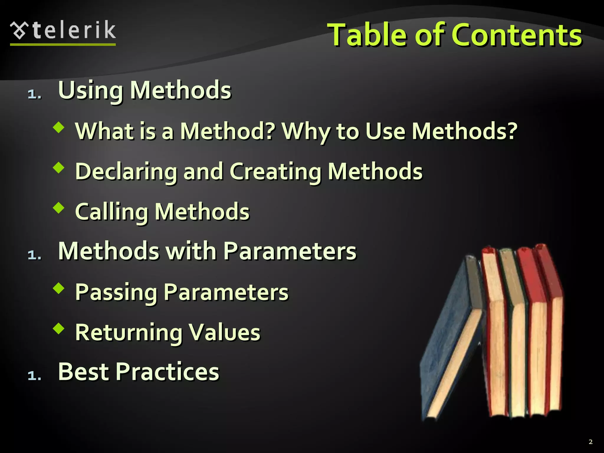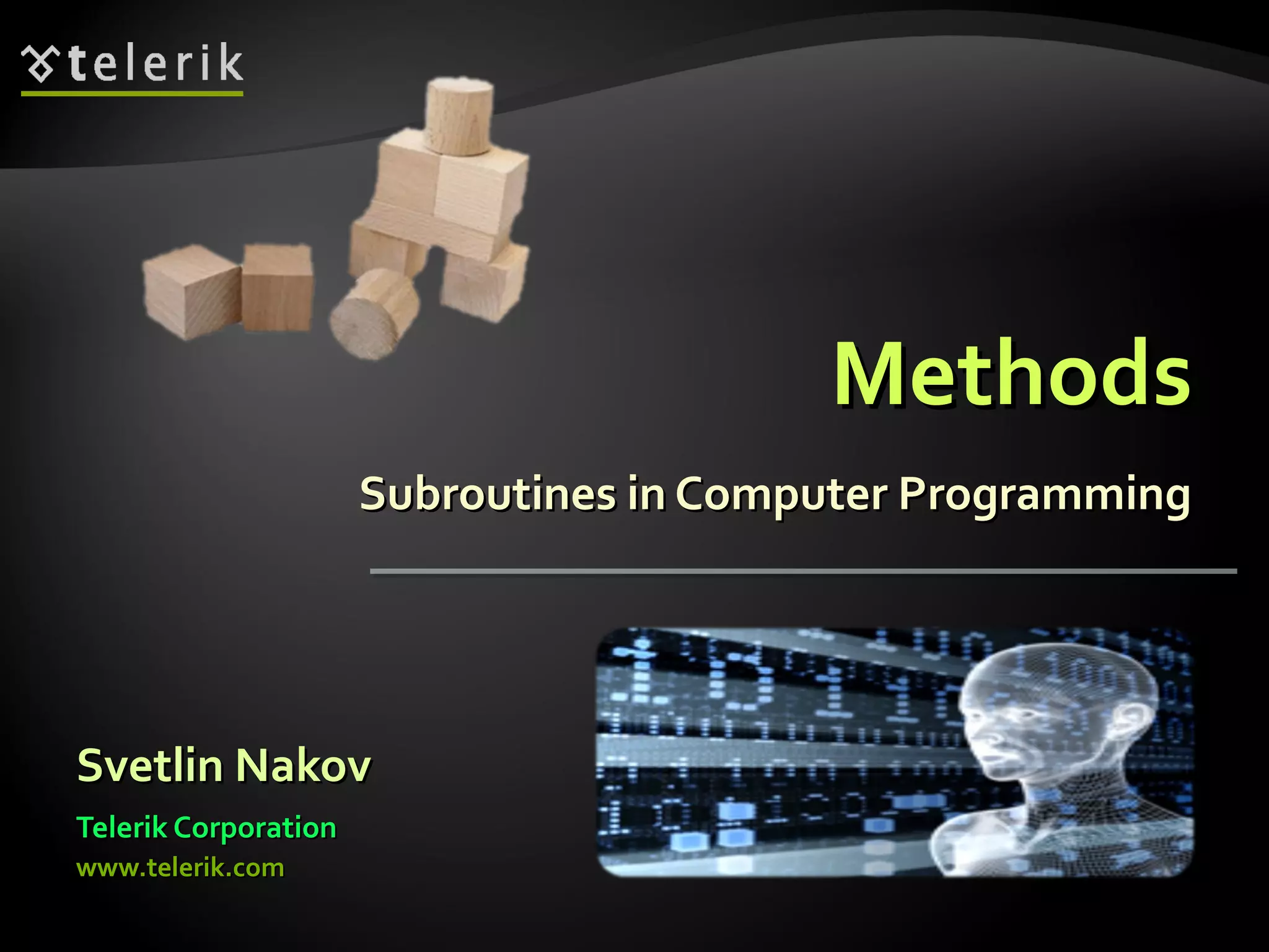This document discusses methods (also called subroutines or functions) in computer programming. It explains that methods allow programmers to break programs into smaller pieces to make them more organized and reusable. The document covers declaring and creating methods, passing parameters to methods, and methods returning values. Examples are provided to demonstrate methods with parameters and methods that return values.