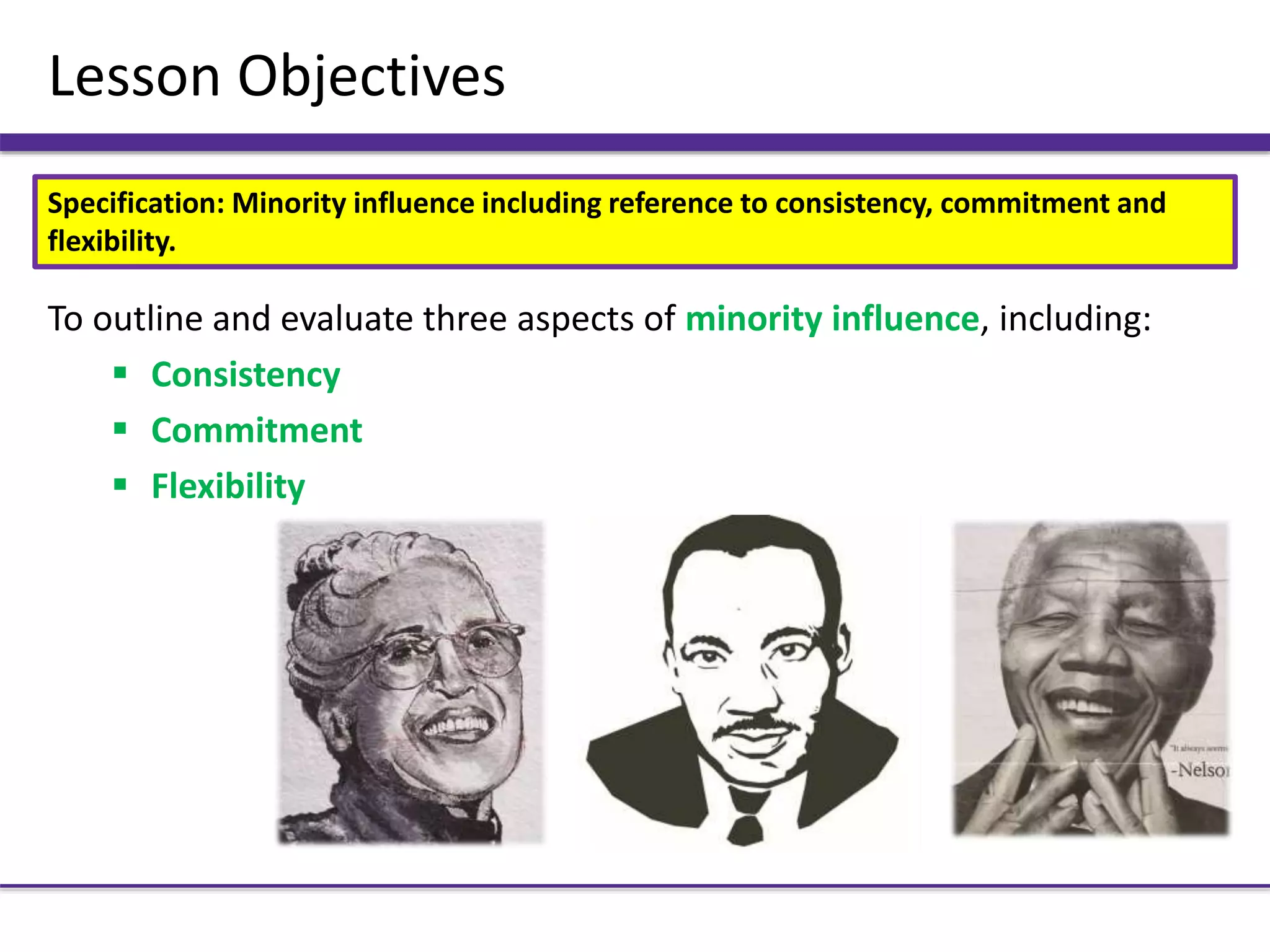 This document outlines key aspects of minority influence, including consistency, commitment, and flexibility. It discusses research by Moscovici from 1969 that found a consistent minority was more influential than an inconsistent one. Real-life examples include Martin Luther King Jr.'s consistent views influencing the civil rights movement, and Rosa Parks' commitment sparking further action. The document also discusses how a flexible minority in Nemeth's 1986 study was more persuasive than an inflexible one.