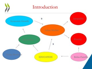 The document discusses education and inclusive growth in Brazil. It summarizes that while access to education has improved substantially, reducing inequality, productivity remains low due to poor education quality. Test scores are below OECD averages and have improved slowly. This skills gap and low innovation rate have led to a decline in Brazil's potential growth rate. The quality of management in public schools is essential to address these issues.